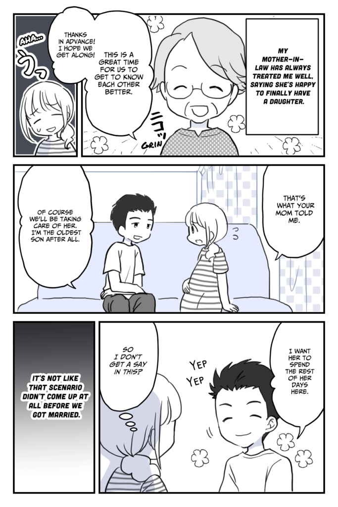 I (Yuka) am a full-time housewife in my second year of marriage. I am currently seven months pregnant and expecting my first child. My husband is older than me and is the eldest brother. I am an only child. A few years before he married me, he built a house on his mother-in-law’s land and lived there by himself. I now live in that house with my husband, and we have a “mother-in-law room” in our house.