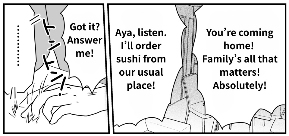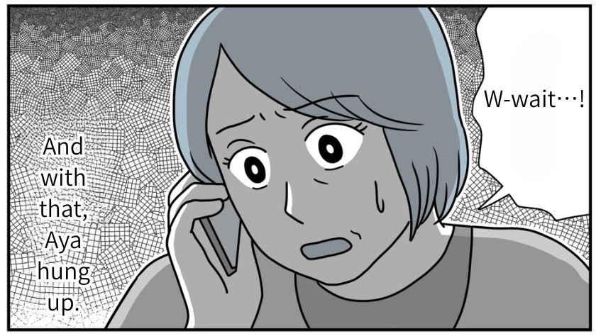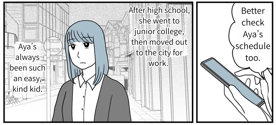 Raising my daughters on my own was never easy. I may not have been the perfect mother, but I did my best to face them with all I had. Seeing Miyuki as a mother now, and Aya growing into a fine young adult, fills me with happiness. We once spent every day together, but now that they live apart, we only meet once in a while. That’s why I looked forward so much to the day we could reunite and laugh together again… Yet Aya’s reply was a blunt “I can’t come home,” followed by the shocking words, “I quit being your daughter.” Is this some kind of late rebellion…? I can’t help but be troubled.