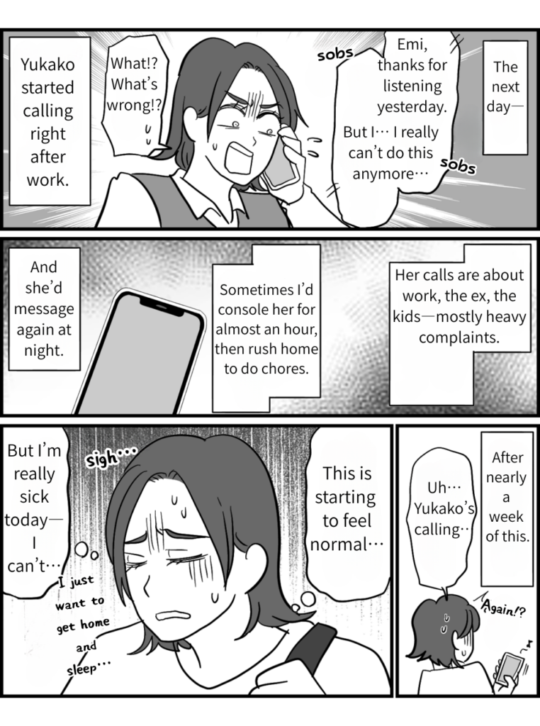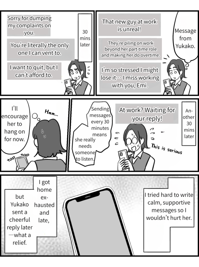 The next morning, I was shocked to see countless missed calls and messages. Among them was a text from Yukako that just said “I can’t take it anymore.”