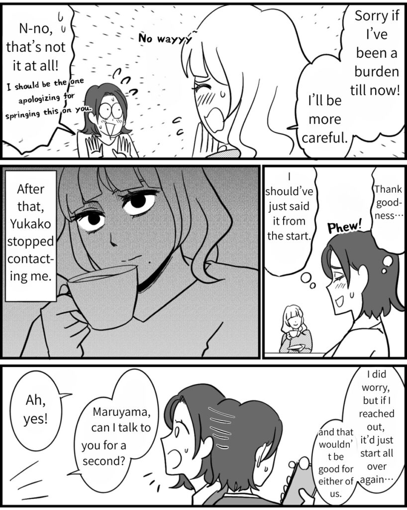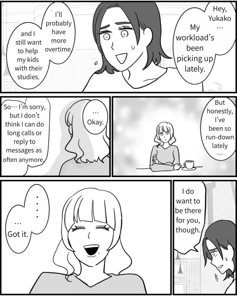 This is something that happened a little while ago. Back then, I became friends at my part-time job with Yukako Hotta, a single mom. But once Yukako quit and our friendship grew closer, she started calling me every day to vent and flooding me with constant messages. Feeling overwhelmed, I asked my sister for advice, and she told me, “She’s completely dependent on you.” That’s when I decided I needed to set boundaries in my relationship with Yukako.