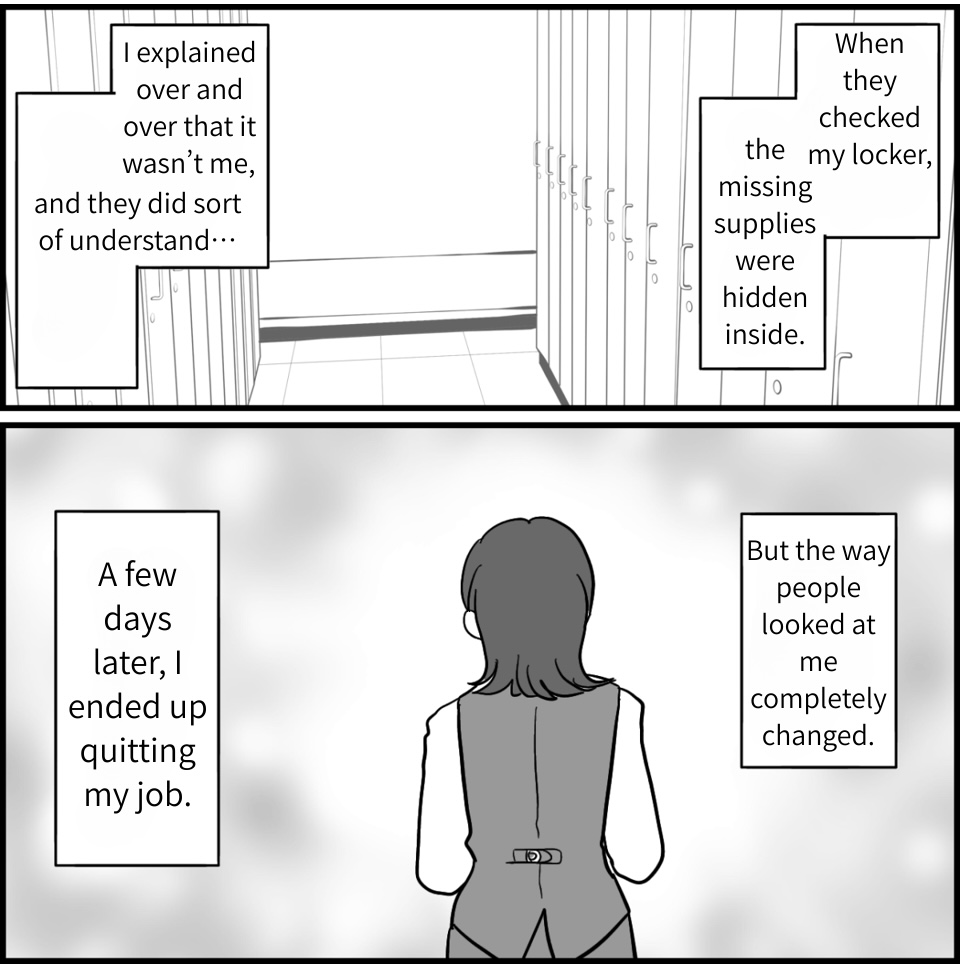 It was something that should have been impossible, but a missing supply was found in the back of my locker… I kept insisting it wasn’t me, and in the end, they accepted my explanation on the condition that I returned the item. But since the evidence had turned up right in front of everyone, that “understanding” was really just for show. The way my coworkers looked at me completely changed. I was overwhelmed by the fear that someone I didn’t even know had set me up… In the end, just a few days later, I made the decision to quit my part-time job.