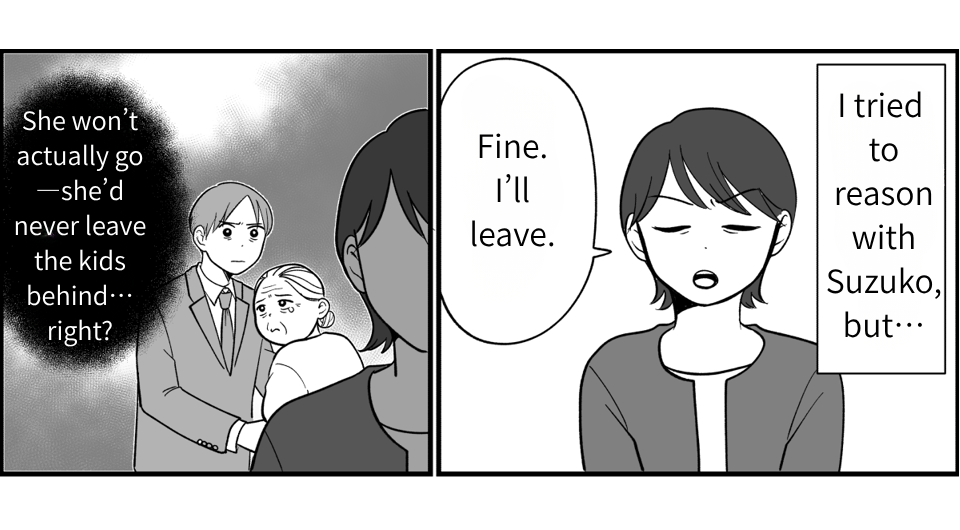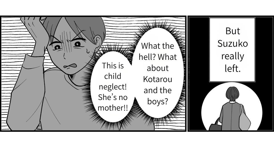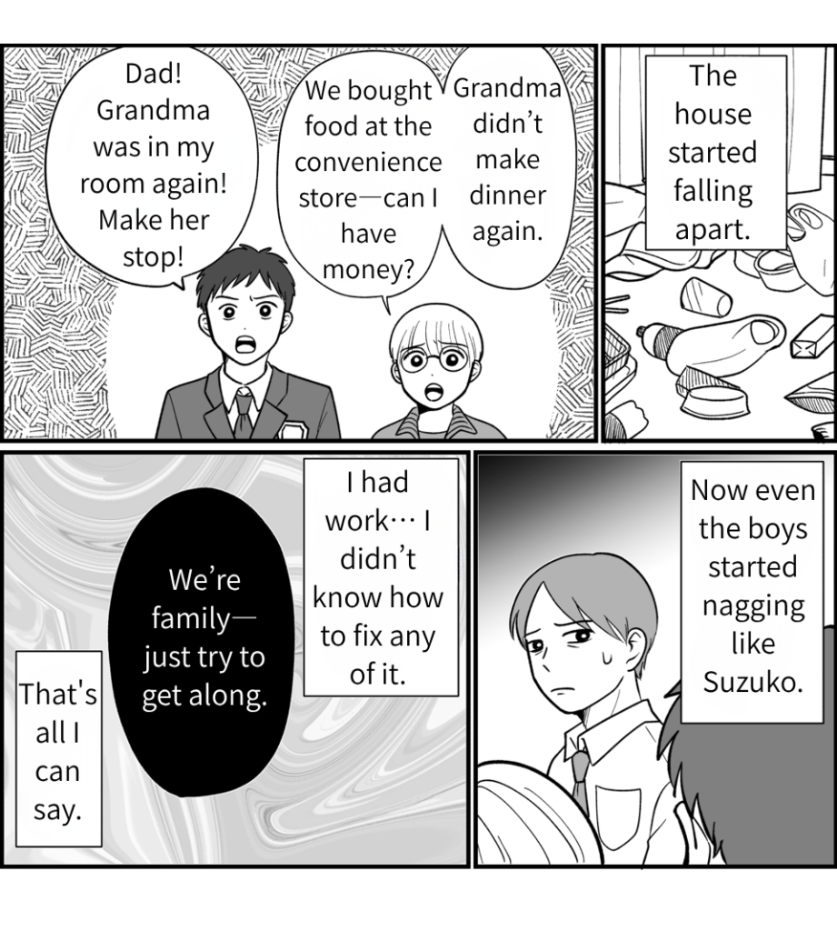 I’m Shinji. I live with my wife, Suzuko, and our two sons. My father recently passed away, leaving my mother to live alone. She kept saying she was lonely, and I felt sorry for her, so I agreed when she suggested that we live together. Suzuko complained at first, but I managed to convince her in the end. However, even after we started living together, she hasn’t stopped grumbling. I wish she’d try to get along—this situation is giving me a headache.