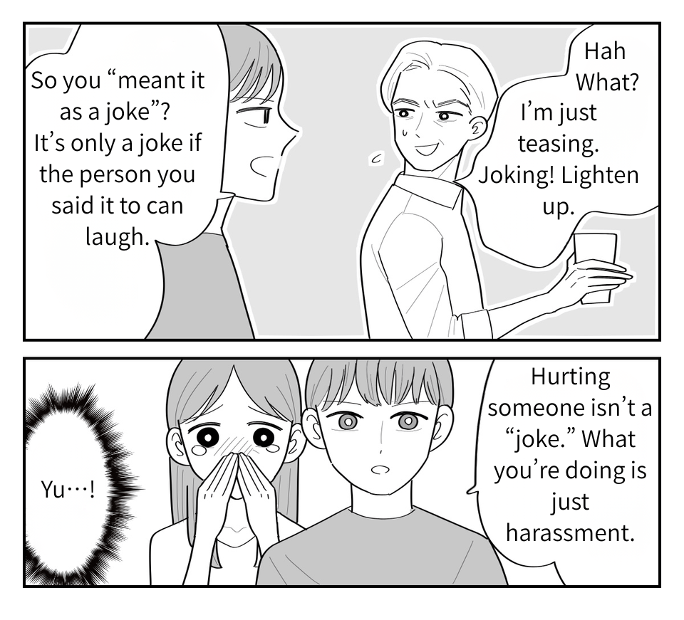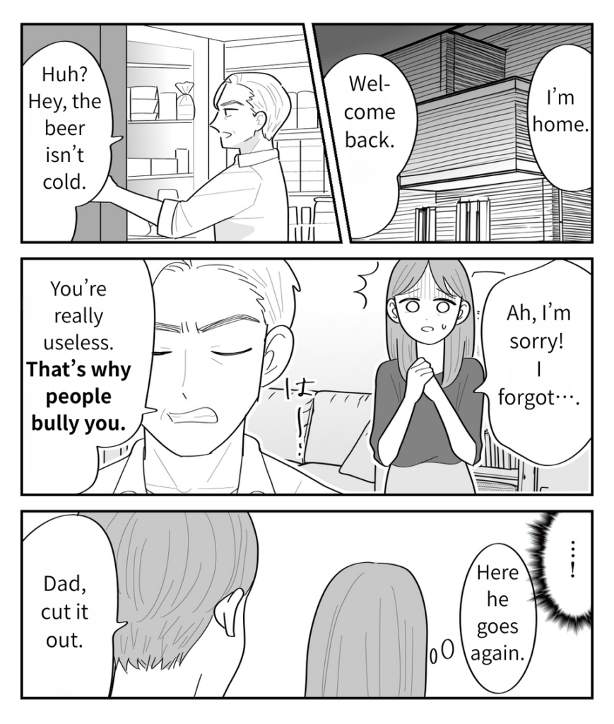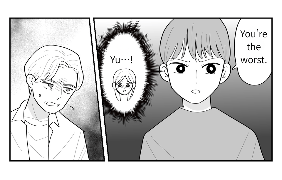 That day Hiroki blew up because the beer wasn’t cold and tossed out his usual line: “That’s why you got bullied.” As always, I froze and couldn’t answer back. But this time, Yuu didn’t stay quiet.