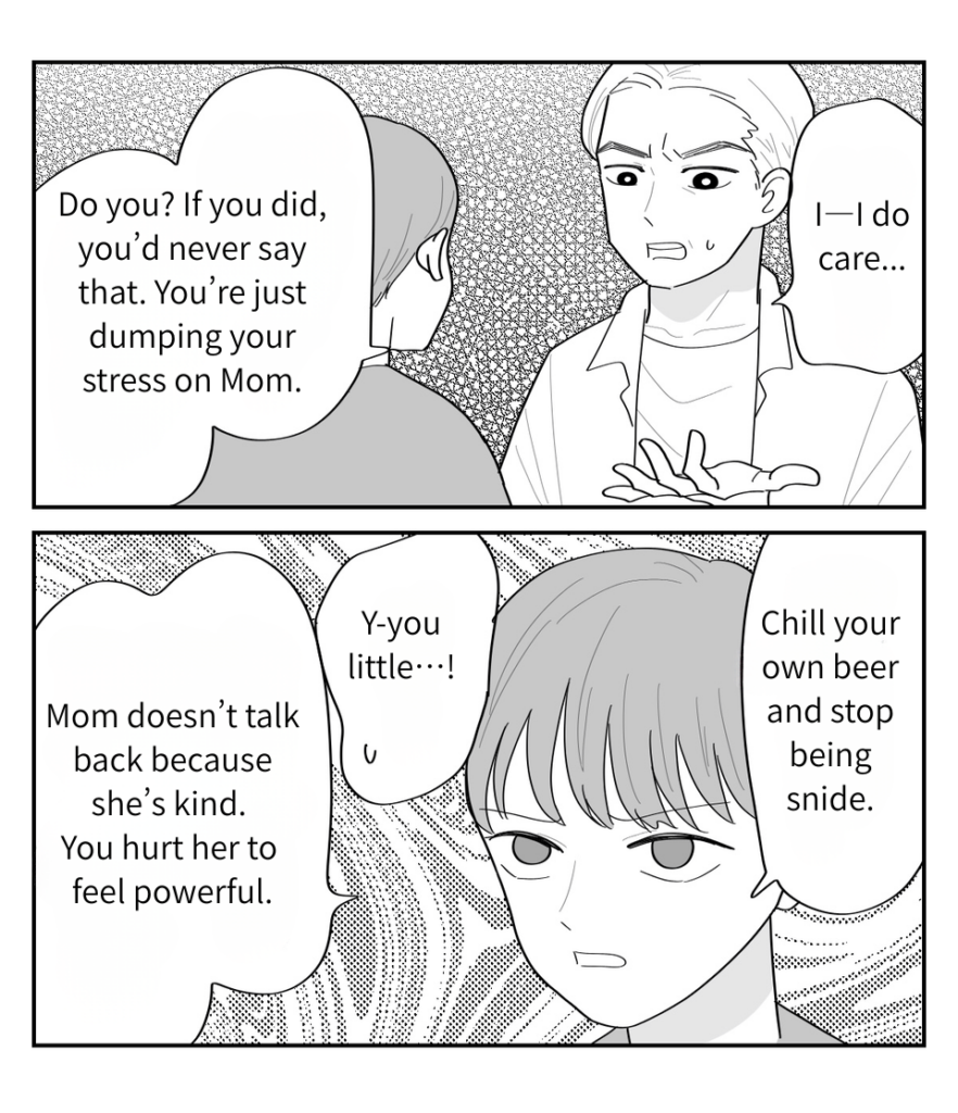 I guess seeing his dad go after his mom had been weighing on him for a while. His unexpected support left me stunned.