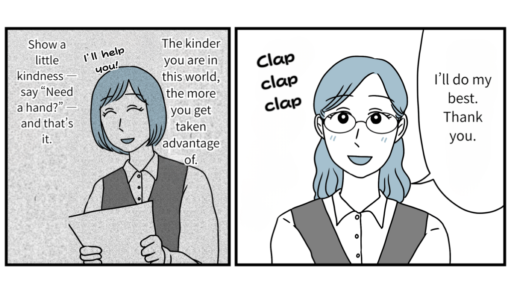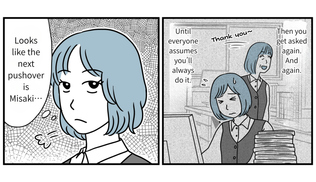 She was probably talked into it and couldn’t say no.She just transferred here from another prefecture, so there’s no way she understands how things work around here. It’s obvious she’s going to have a rough time. Maybe deep down she thinks it’s a hassle too—but honestly, that’s her fault for not refusing outright.The world works in a way that punishes kindness.The moment you say something like, “I’ll do it,” out of a little goodwill, you’re doomed.
