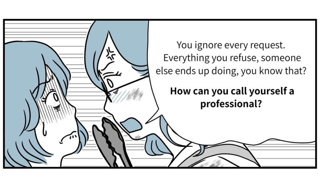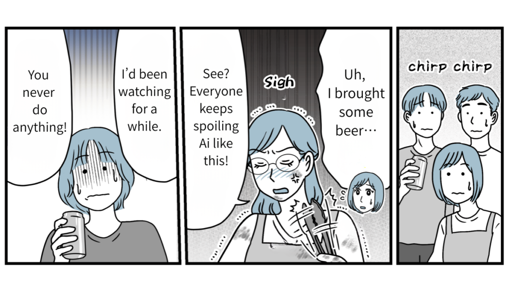Since I refused, the role went to Misaki, who’d just been transferred from headquarters. Whenever she asked me to do something, I’d just say, “No way,” or “Can’t do it,” until she gave up. Then, at the office BBQ, Misaki snapped and came at me: “You won’t lead, you won’t help, so what exactly can you do?”