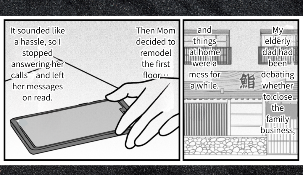 Mom sometimes texted me about remodeling our family’s old sushi shop. But when I finally went home for the first time in a while, I was shocked. The big, weathered sushi sign was gone—replaced by a small, shiny new one. It looked like a completely different place.