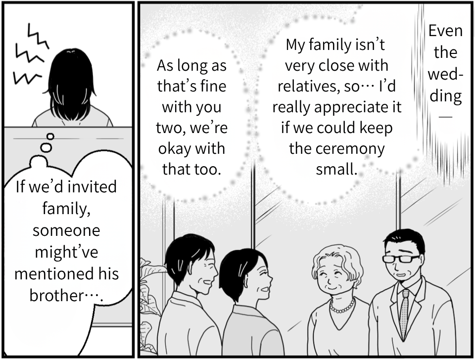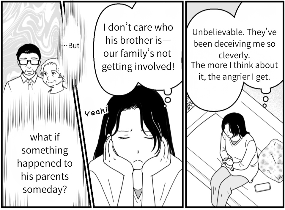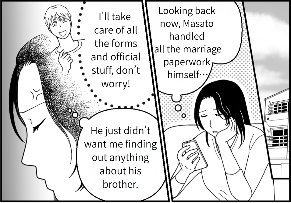 The more I thought about it, the more anxious I became. Back when we got married, I saw Masato’s initiative—how he handled all the arrangements—as a sign of reliability. But now, I realize he probably just didn’t want me to find out about his brother. That thought made me feel betrayed all over again.