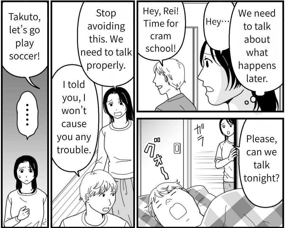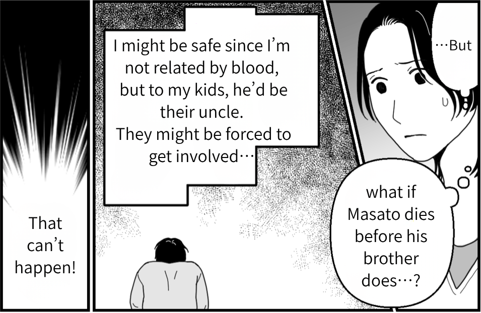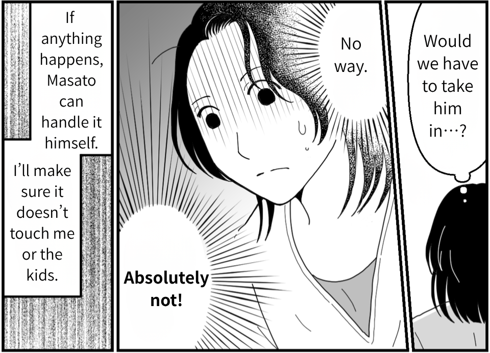 What worried me most, though, was the kids. I couldn’t let them ever be forced to take care of their uncle someday. But whenever I tried to talk about it, Masato would brush me off with, “Don’t worry, I’ll handle it,” and refuse to have a serious discussion. I hadn’t told the kids anything, so I couldn’t let them sense the tension between us. Still, finding a quiet moment alone with Masato to talk things through felt impossible, and that left me trapped in days of growing frustration.