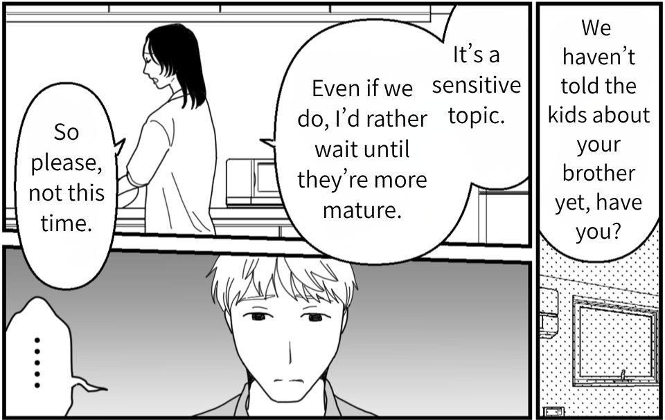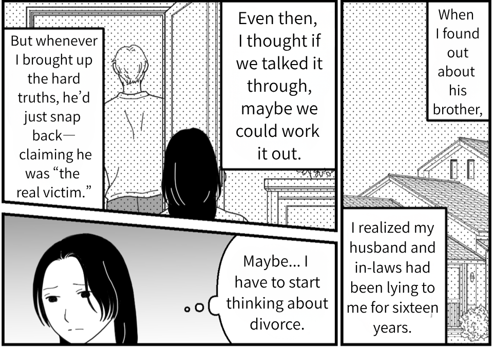 Maybe this is the end for us. That’s what I’ve started to think. Even if I set aside the fact that he hid his brother’s existence, I’ve lost all confidence in a marriage where meaningful communication doesn’t exist. It’s frightening how a life that once felt so happy can crumble in an instant.