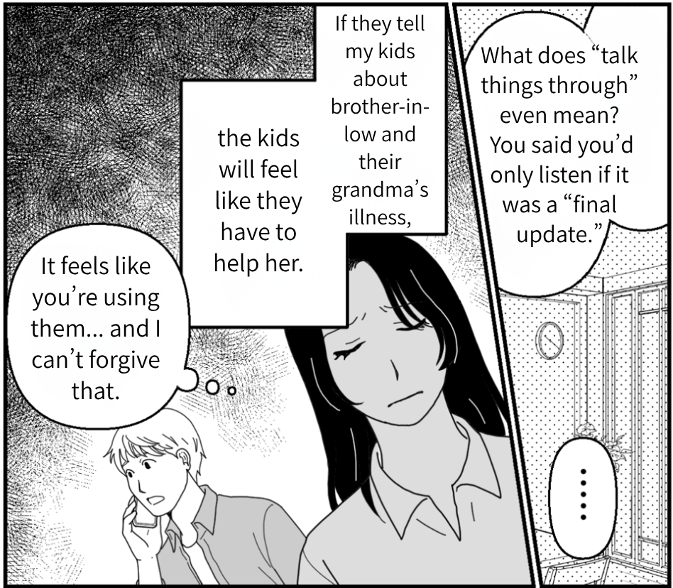 And now, I’ve discovered something even worse—his parents are trying to involve our children. Maybe they’re trying to appeal to the kids’ sense of kindness or guilt, but I can’t let that happen. If his parents show up this weekend as they’re threatening to, I’m seriously considering taking the kids and staying at my parents’ place for a while.
