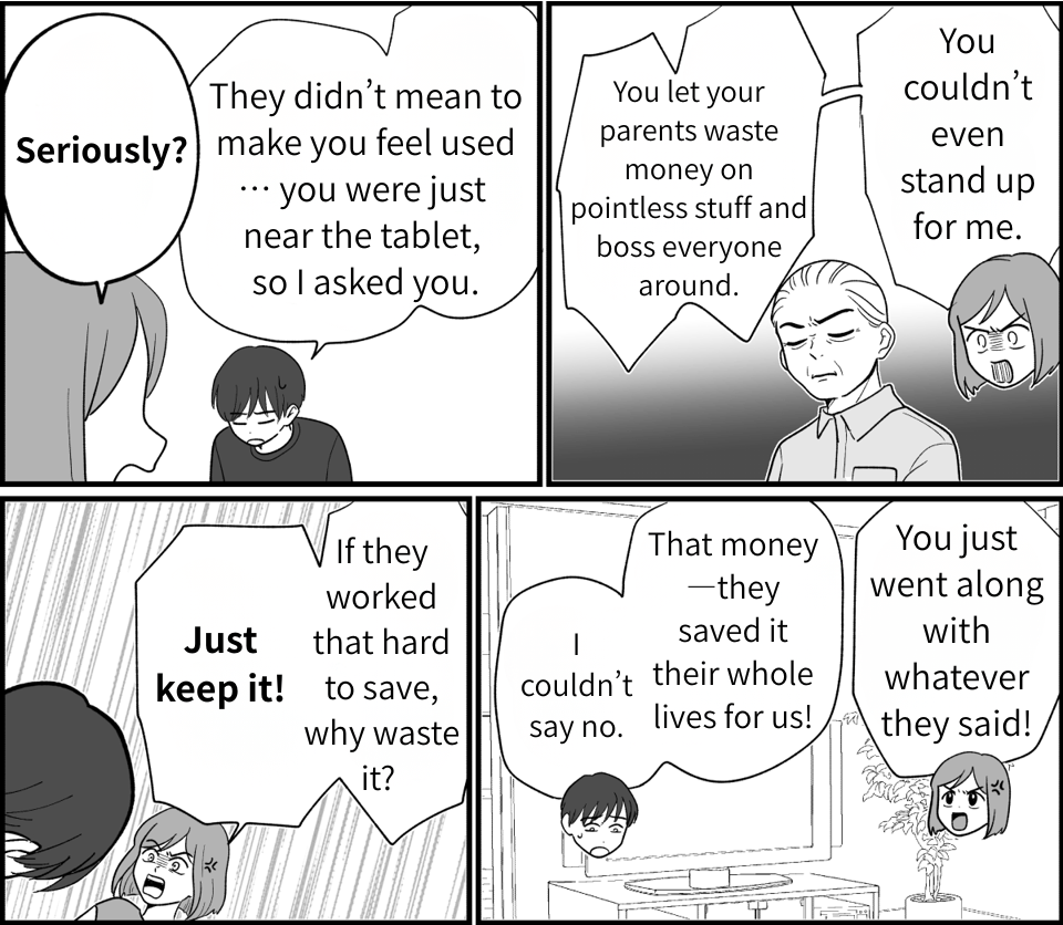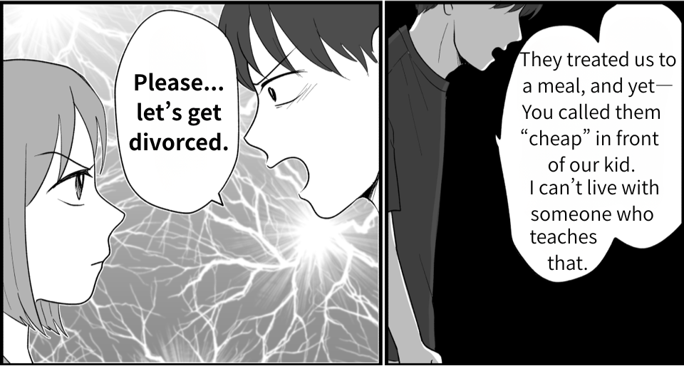 My parents adore Yusuke, and no matter how I try to explain things, I know they’ll be hurt. While I was torn about how to handle it, Yusuke called my parents “stingy.” That one word completely broke me.