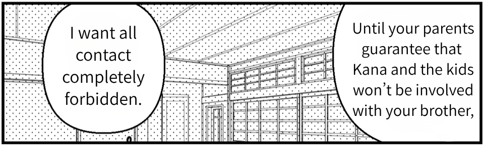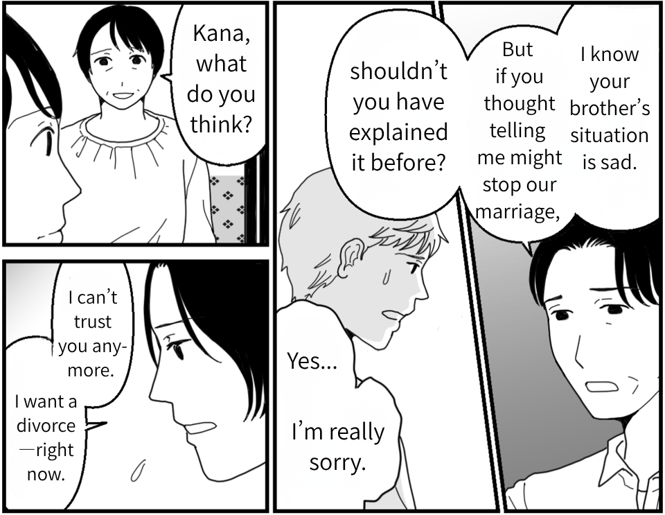 My father confronted him right away: “I hear you’ve been treating my daughter pretty badly.” Masato must have realized things were serious when I actually said the word divorce. He got down on his knees again and promised—sincerely this time—that he’d never let me or the kids have anything to do with his brother.