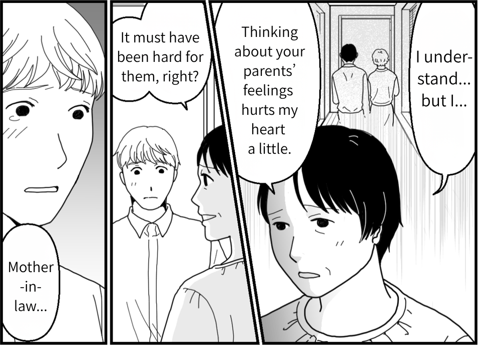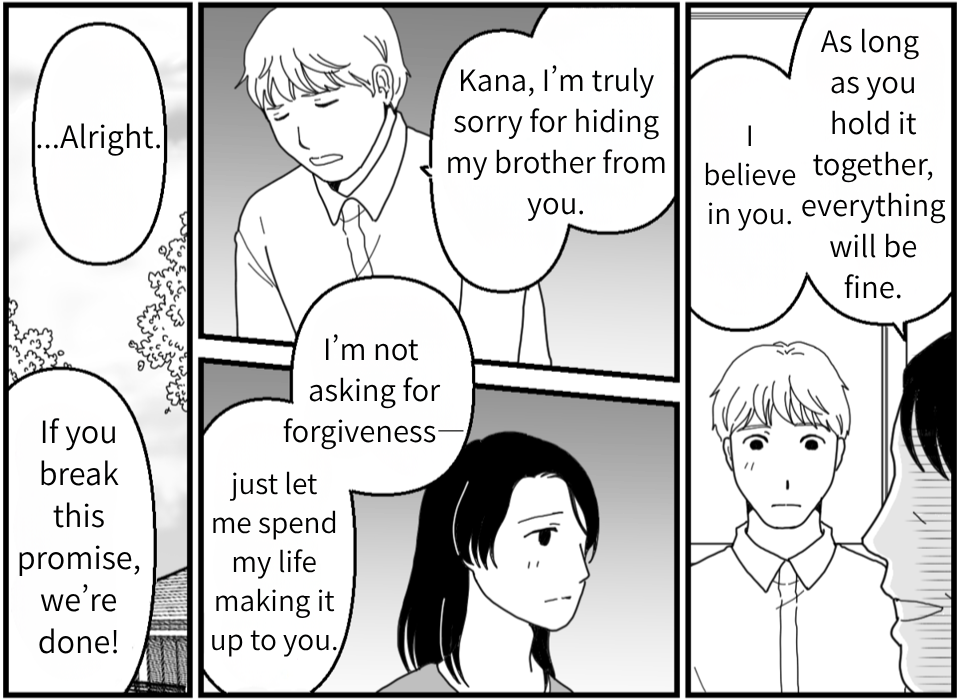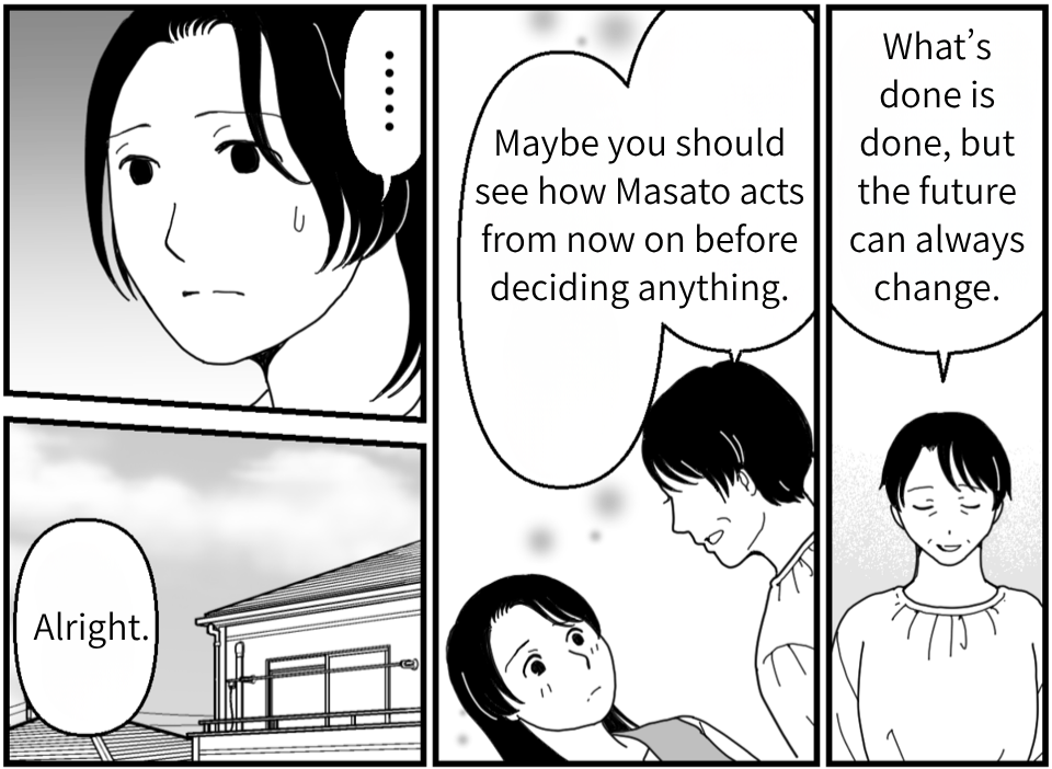 The last few days, I’d been so angry I could barely think straight. But thanks to my parents, I calmed down enough to think clearly. For the first time, I felt like maybe—just maybe—I could try trusting Masato again. My mother’s words also helped me take a step back. For now, I’ve decided to hold off on the divorce and go home with the kids.