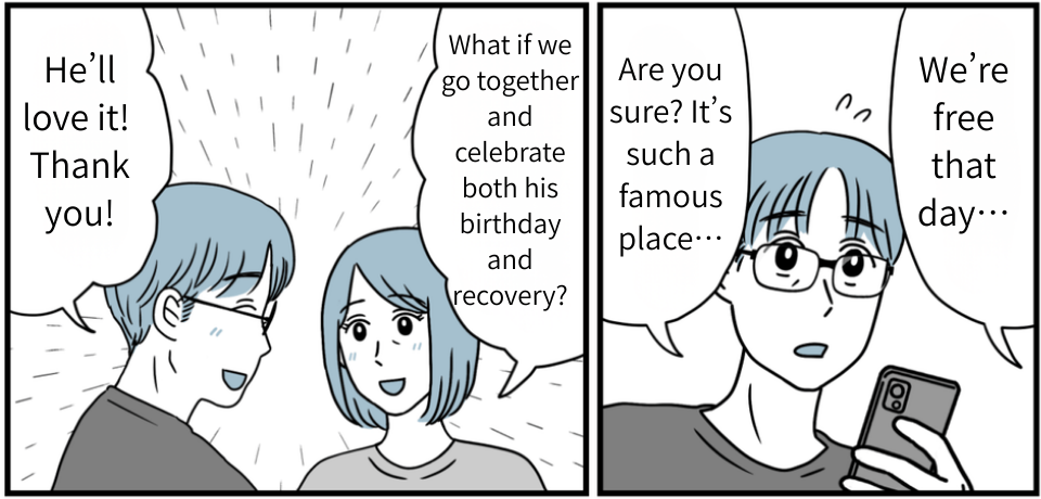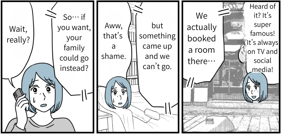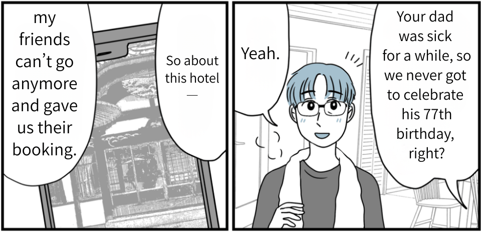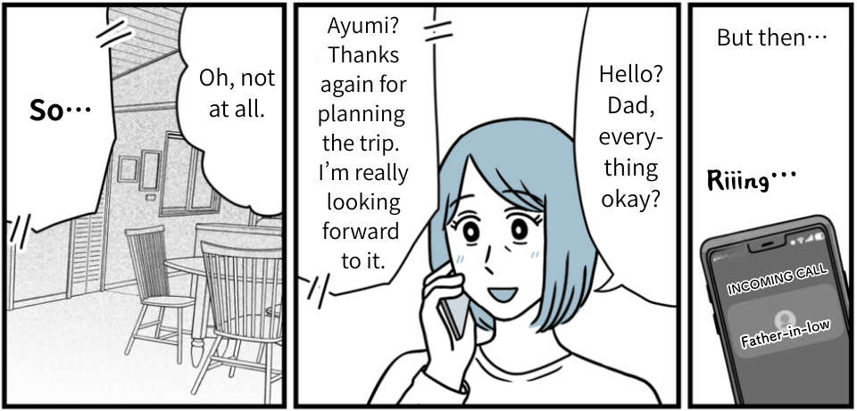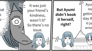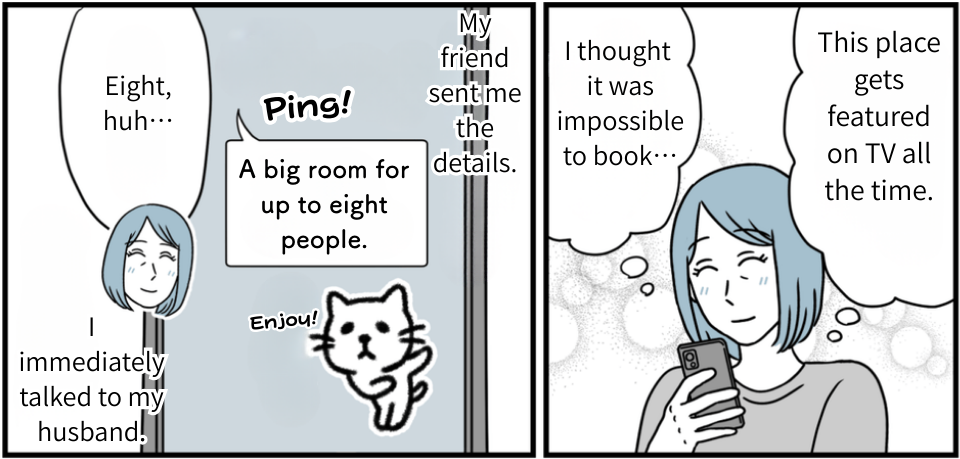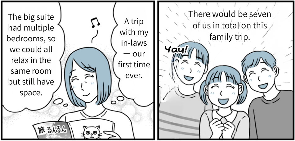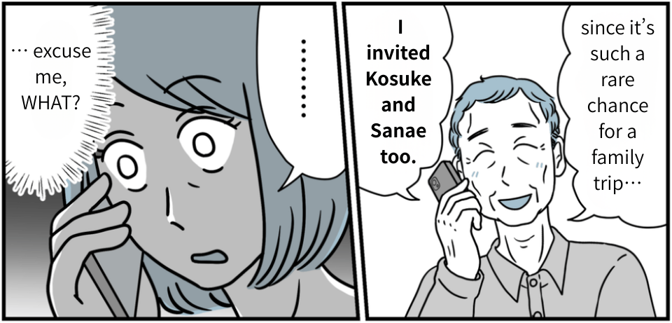 I froze. The trip I planned for just us and my in-laws — and now Kosuke’s entire family and Sanae are coming too?! How does that make sense?! The room only fits eight people, and we already have seven with just our family plus my in-laws. My brain couldn’t keep up with how recklessly my father-in-law acted.