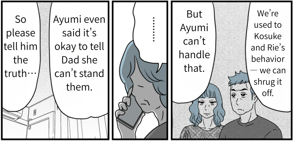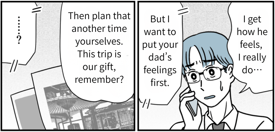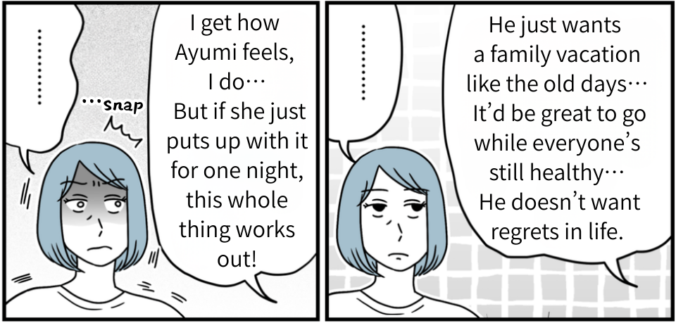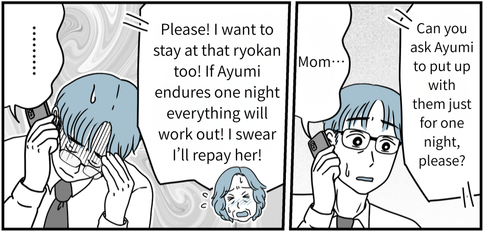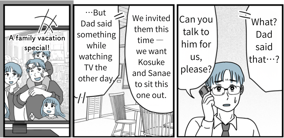 One day, we invited Kazuma’s parents on a trip to stay at a nice ryokan. Everything was set… until my father-in-law suddenly announced he had already invited the other siblings too. We tried calling to ask them to sit this one out, but Kosuke basically threatened us over the phone — he wouldn’t even listen. So my husband called his mom instead.