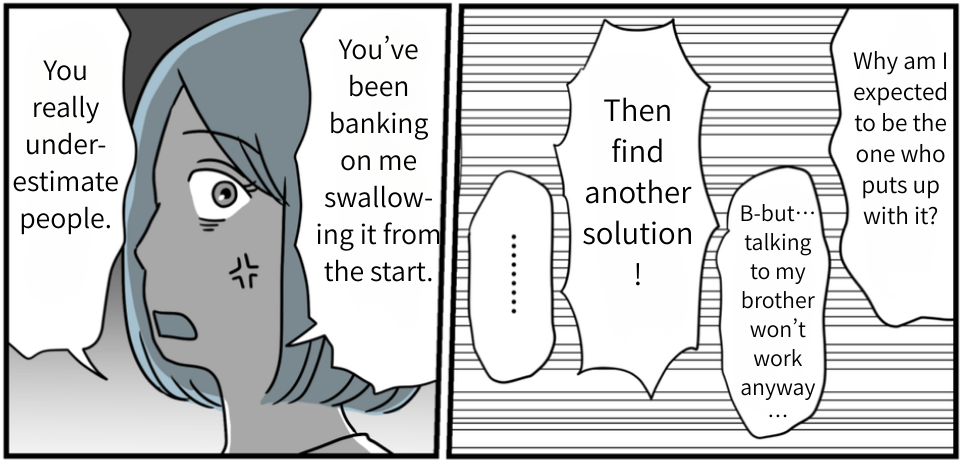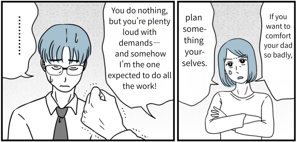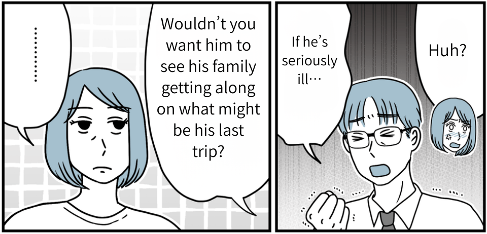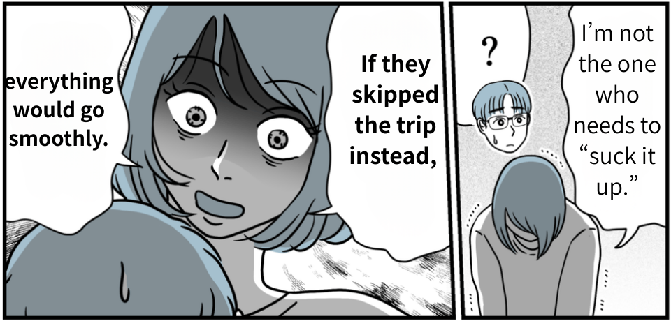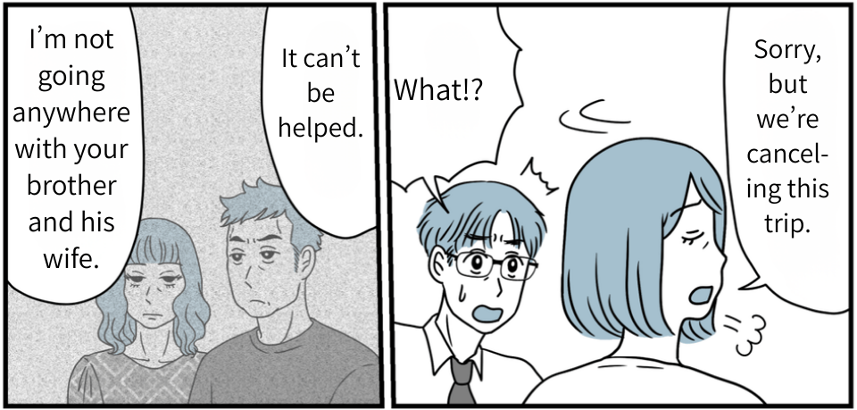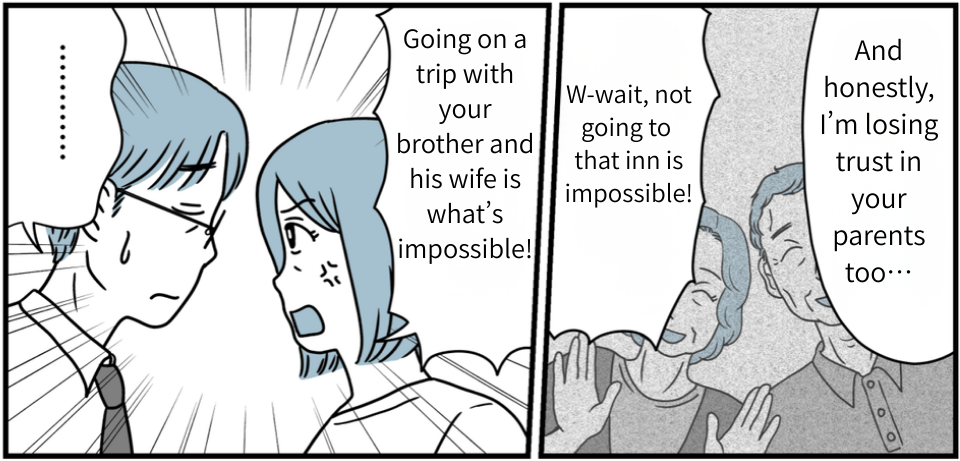 One day, we planned a trip to a traditional inn with just his parents. But then my father-in-law went ahead and invited the other siblings without asking. Kosuke immediately started pressuring us in that intimidating way he always does, and my mother-in-law and even my husband said the usual: “Everything will go smoothly if you just put up with it.” Seriously…?