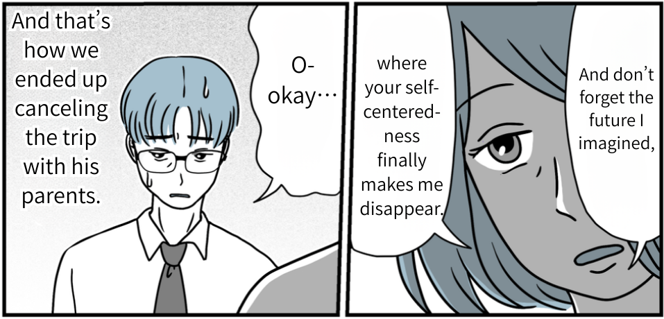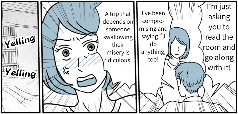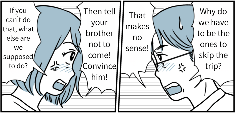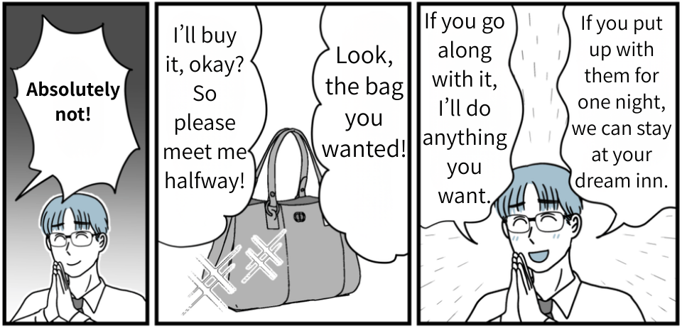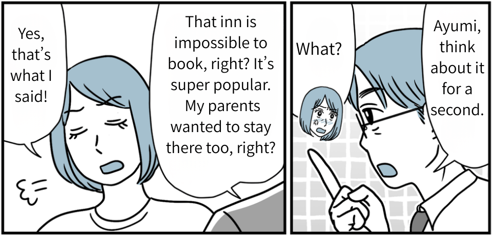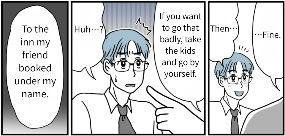I never imagined my husband would be this unwilling to understand. My friend had passed along a reservation to an amazing inn, and I know it wasn’t easy for him to give that up. But if that’s the case, then he should be doing something about his brother and sister-in-law—not begging me to be the only one who compromises. Kosuke would never budge, and my father-in-law is convinced we’ll all be going together. Neither my mother-in-law nor my husband has the strength to push back against him.