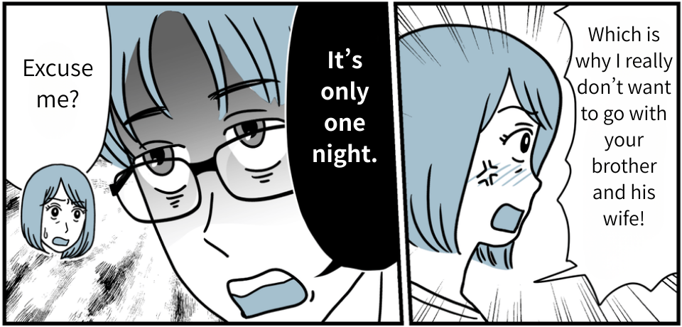 I live with my husband, Kazuma, and our three kids. He’s the middle of three siblings—his older brother, Kosuke, and his younger sister, Sanae. One day we decided to invite his parents on an overnight trip to a nice inn. Then out of nowhere, my father-in-law announced he’d already invited the other siblings too. The problem is, I can’t stand my domineering brother-in-law and his wife, and I’ve gone out of my way to avoid them for years.