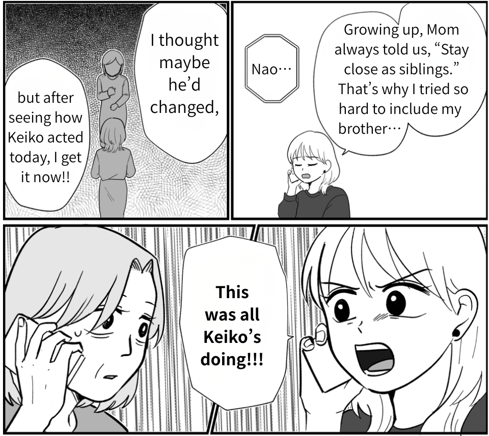 I’m sure my mom will talk to my brother in just the right way. My parents are worried too. And if Keiko is willing to change her attitude, I’m more than ready to forgive what’s happened so far and keep building a good relationship from here on out.