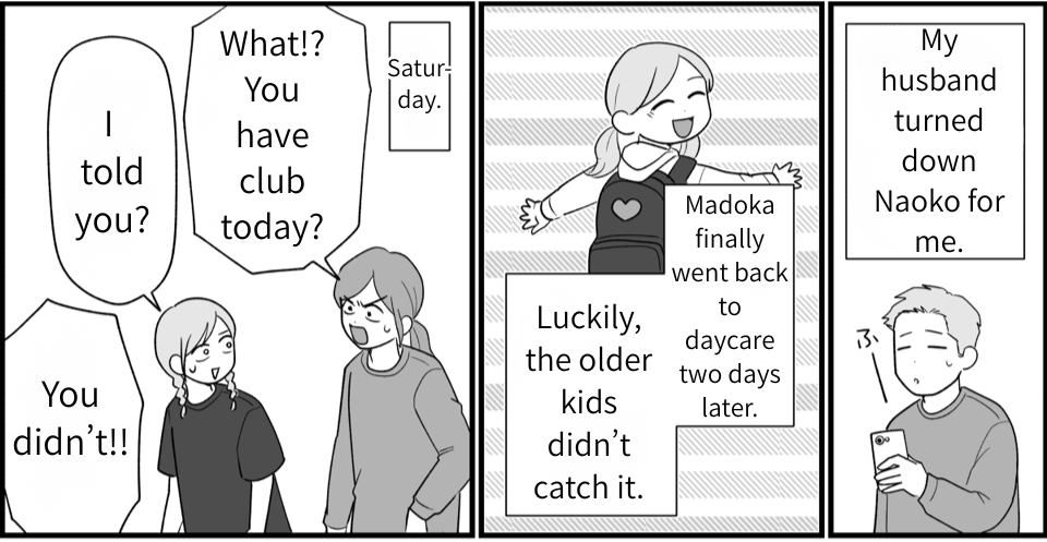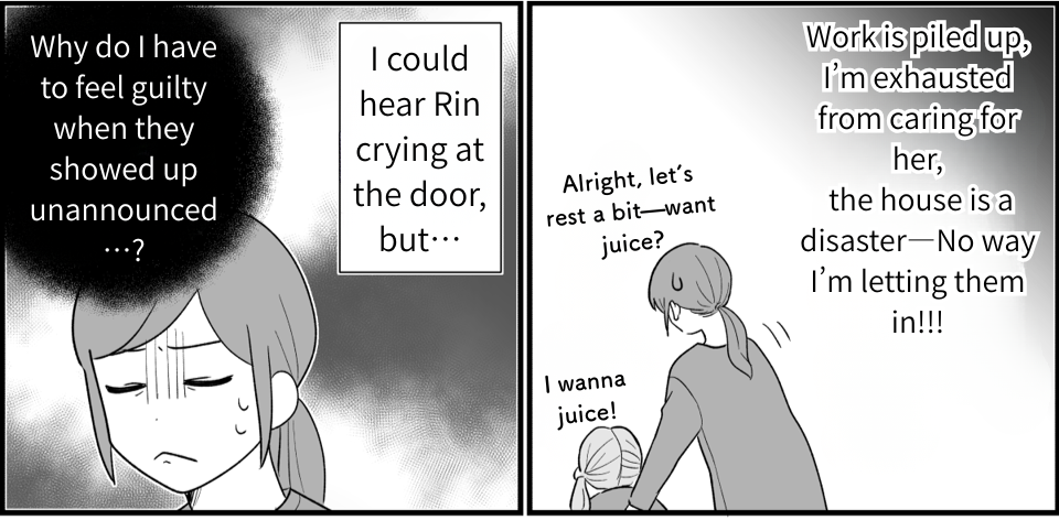 What stresses me out most isn’t the workload… it’s my husband’s sister, Naoko. She loves dropping by our house, and together with my mother-in-law keeps insisting that her daughter, Rin, should be like a “little sister” to my girls. We promised a playdate out of courtesy, but I had to cancel when Madoka caught a bug. Even then, Naoko kept pushing—and honestly, it was a bit much.