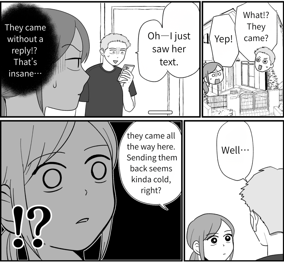 … but then Naoko just showed up unannounced. All she sent beforehand was a quick “We’re coming” text. No confirmation. No reply-wait. And then my husband said, “Well, they came all the way here…” No. Not this time. We need to have a real conversation about boundaries.