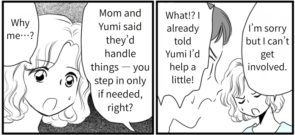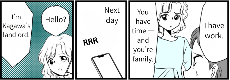 Shaken, I told Hironari I couldn’t take care of her, but then I found out he had already promised his mother and Yumi that I’d help out “to some extent.” And starting the very next day, I began getting call after call — complaints, problems, everything about Kagawa. It seems Yumi and her husband had given everyone my phone number.
