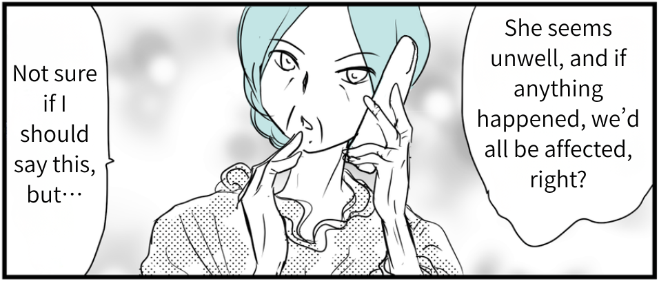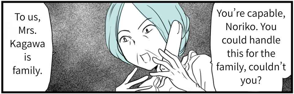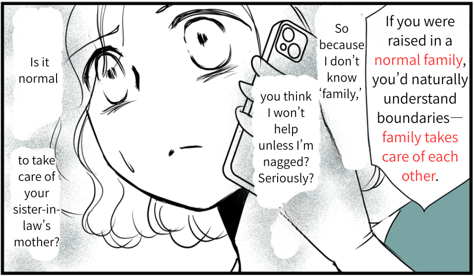 She kept insisting I should look after Mrs. Kagawa because I’m “a stay-at-home wife with time and living nearby,” and even brought up my background and career, hinting that “someone capable should handle it.” Then she implied that because I didn’t grow up in a “normal family,” I don’t understand when to refuse family duties—that I can say no only because I don’t know what family is supposed to be.