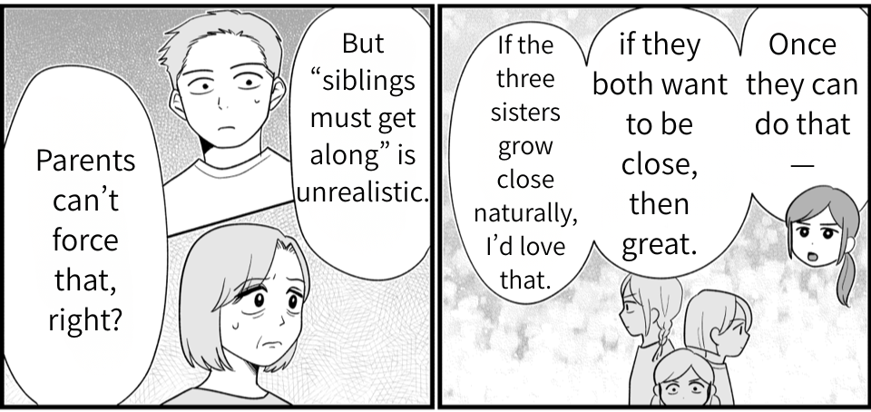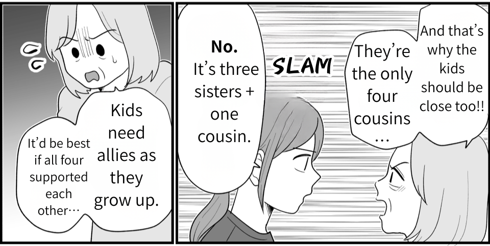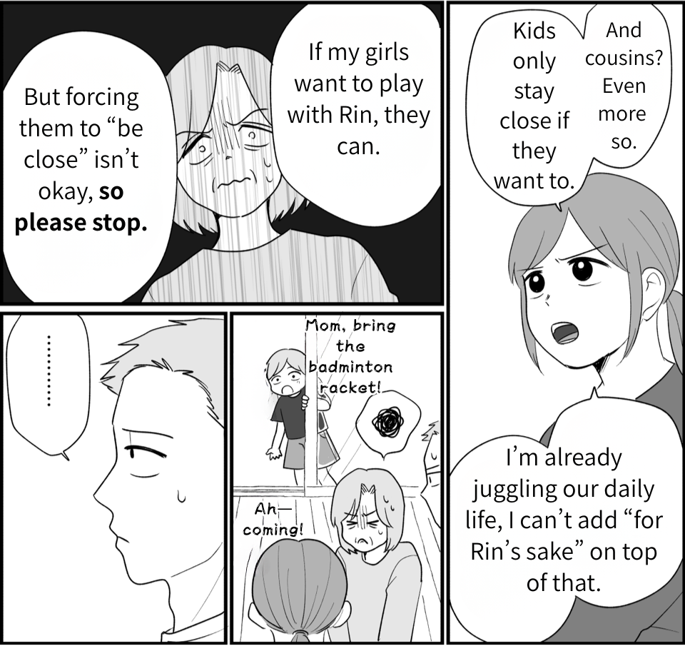 I (Keiko) live with my husband, Koji, and our three daughters—Ayane (8th grade), Kaori (4th grade), and little Madoka, who’s six. The one who causes me trouble is Koji’s younger sister, Nao. She and my mother-in-law keep trying to treat her daughter, Rin, like she’s our girls’ sister, and they show up at our place way too often. We finally agreed to let the kids hang out, but when Madoka got sick, I cancelled. Even then, Nao texted me only “We’re coming!” and suddenly showed up at our door. I couldn’t let them in. Later, when we visited my in-laws, my mother-in-law threw passive-aggressive comments at me about it—so I snapped and told her exactly how I felt.