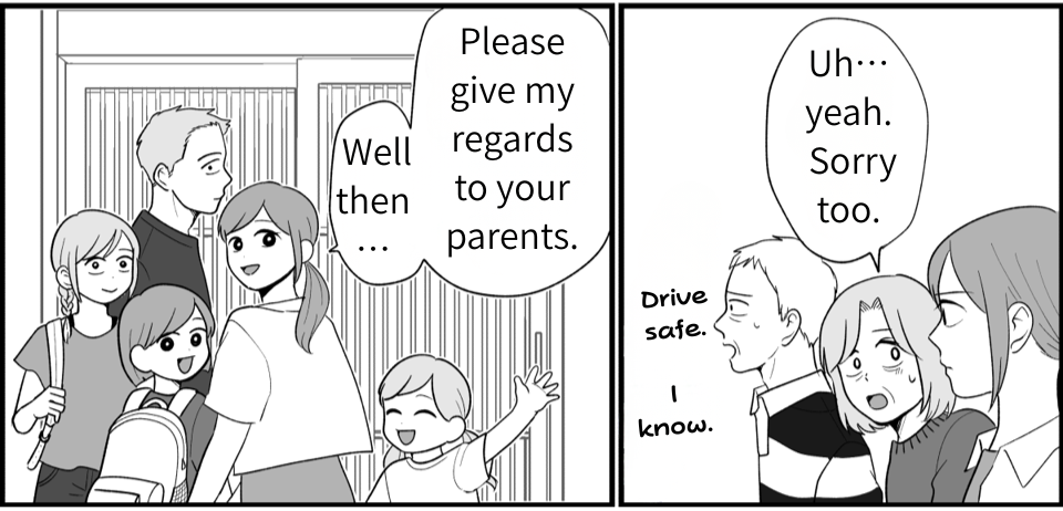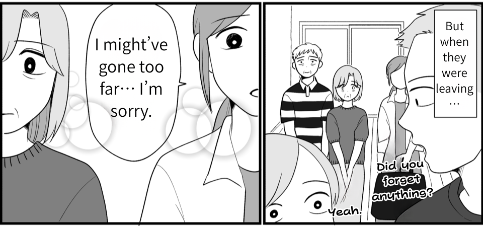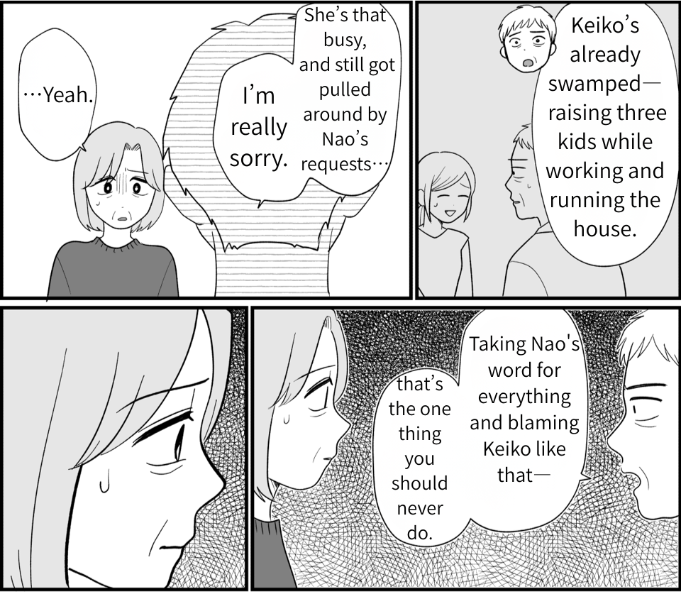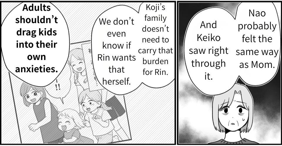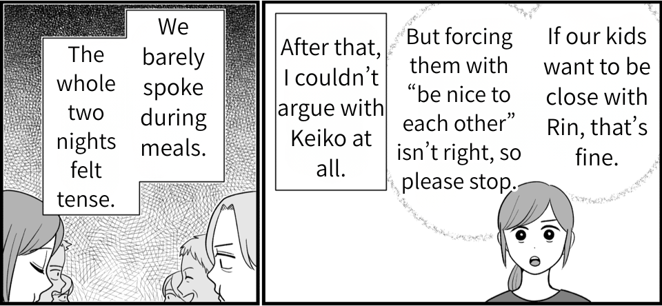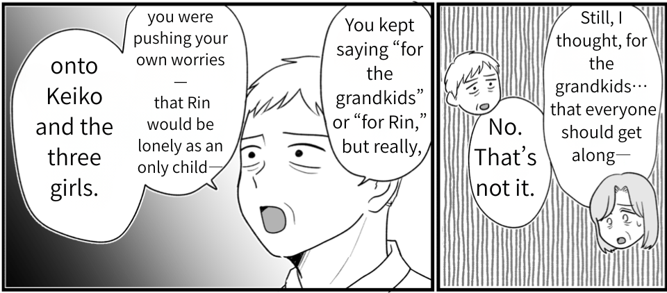 My husband’s words really sank in. I’d been getting irritated at everything Keiko said or did, but that itself was wrong. I realized I was upset because I had expectations—I wanted her to fulfill our wishes. I wanted Rin to join the three girls and for them all to stay close forever. Keiko must have seen right through that hidden agenda. It was wrong of me to expect that from her, and wrong to try to force Rin into the group of three. Keiko may never come back again, but even so, I want to truly reflect on my actions.