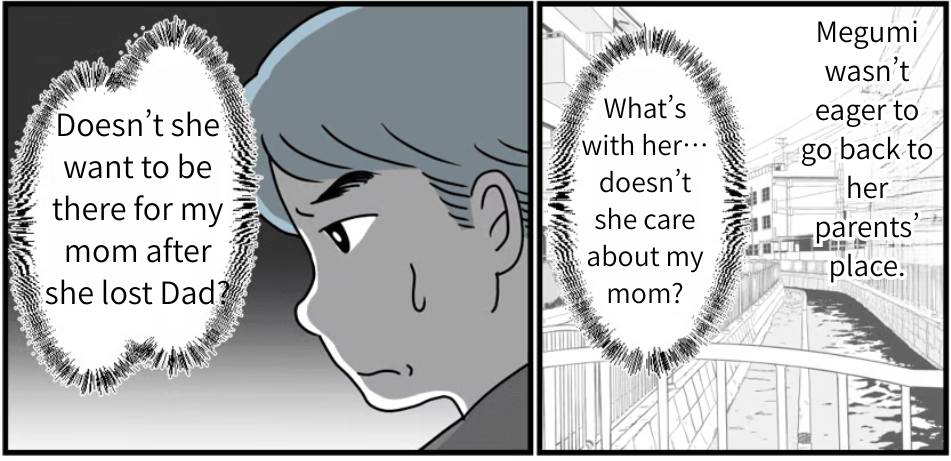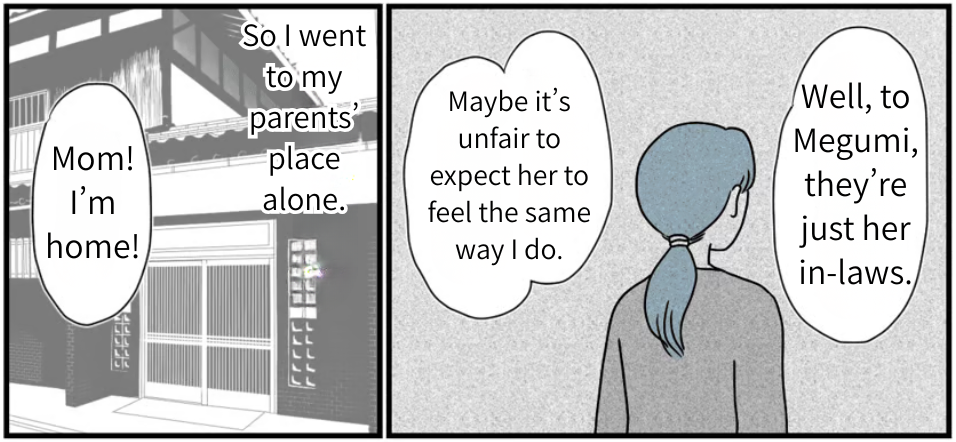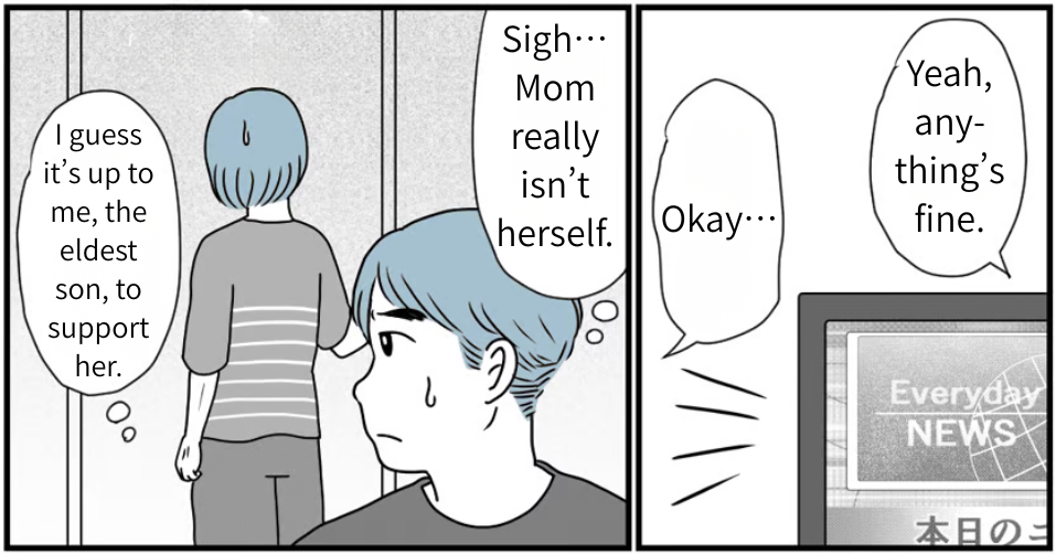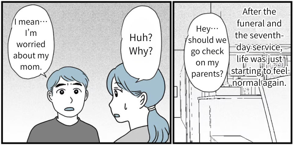 This happened a few years ago. I’m Atsushi Nishida. My dad, who lived at my parents’ house, passed away not long ago. He was a total workaholic, but thanks to him—and my mom—we grew up wanting for nothing. Losing him was devastating. Still, what worried me even more was my mom.