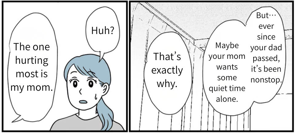 Just thinking about my mom’s home cooking for the first time in a while made my heart lift—until I heard a long, heavy sigh. She seemed so down, sighing more than usual. Her back looked thinner too, like she’d lost weight. Of course she would be like this. She’d just lost the man she loved, and it hadn’t even been a few weeks yet. That’s when I thought it—I had to be there for her. I had to support my mom.