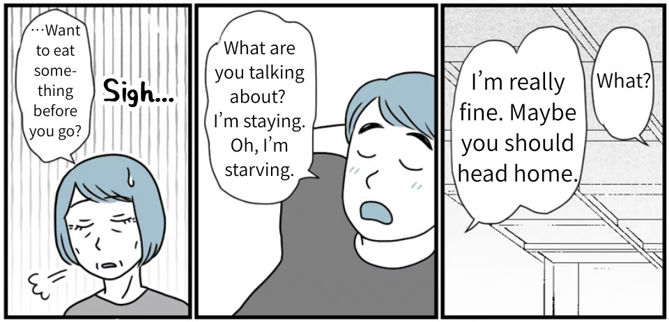 “…I’m really fine, so maybe you should head home soon. Megumi and the kids are waiting for you, right?” “What are you talking about? I’m staying. Man, I’m starving.” “…Do you want to eat something before you go?”