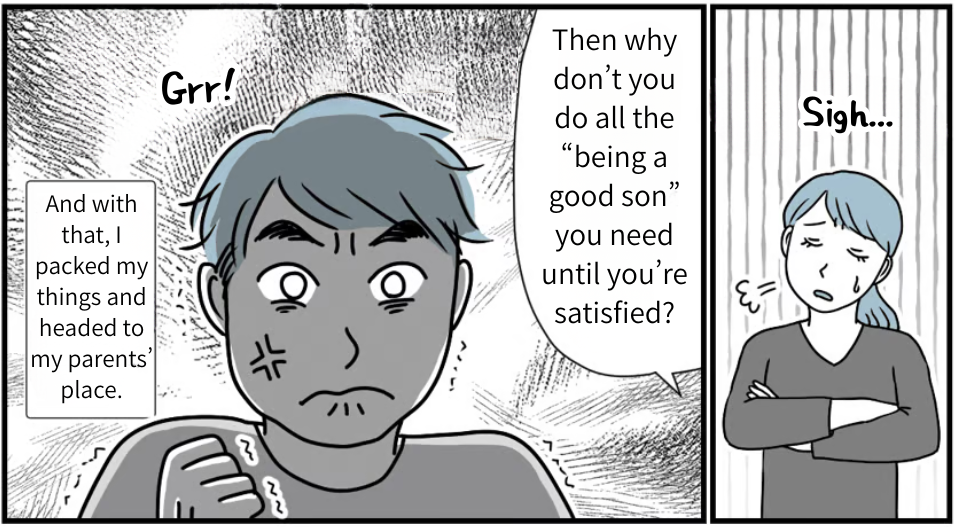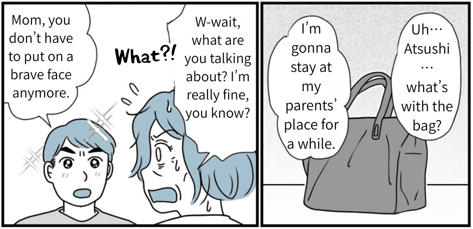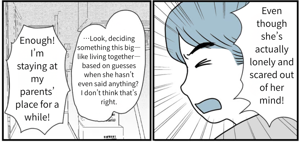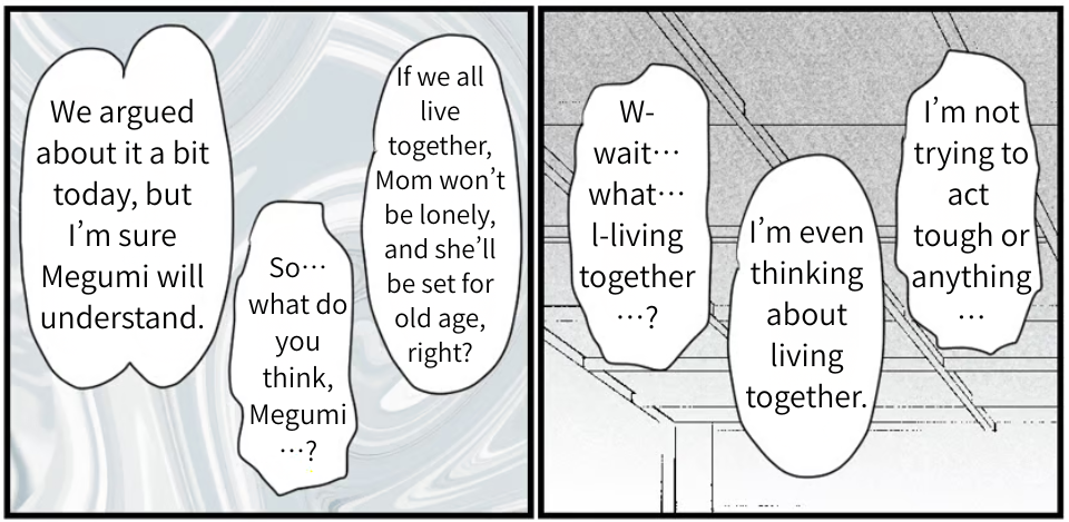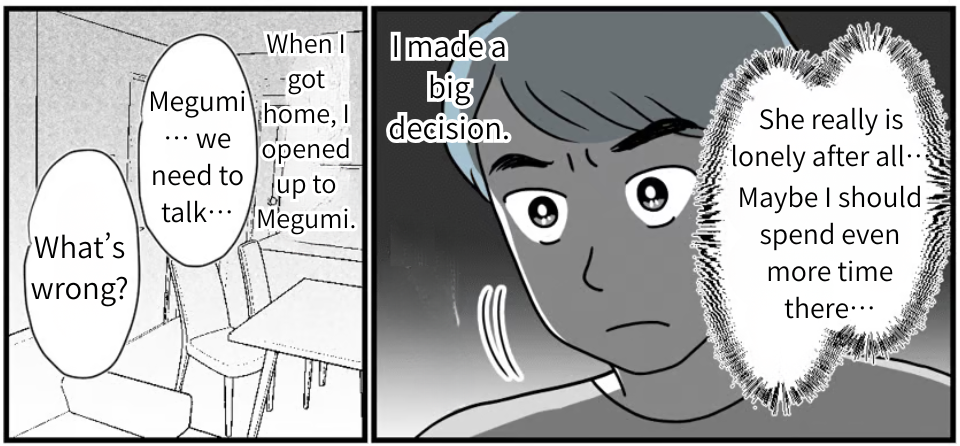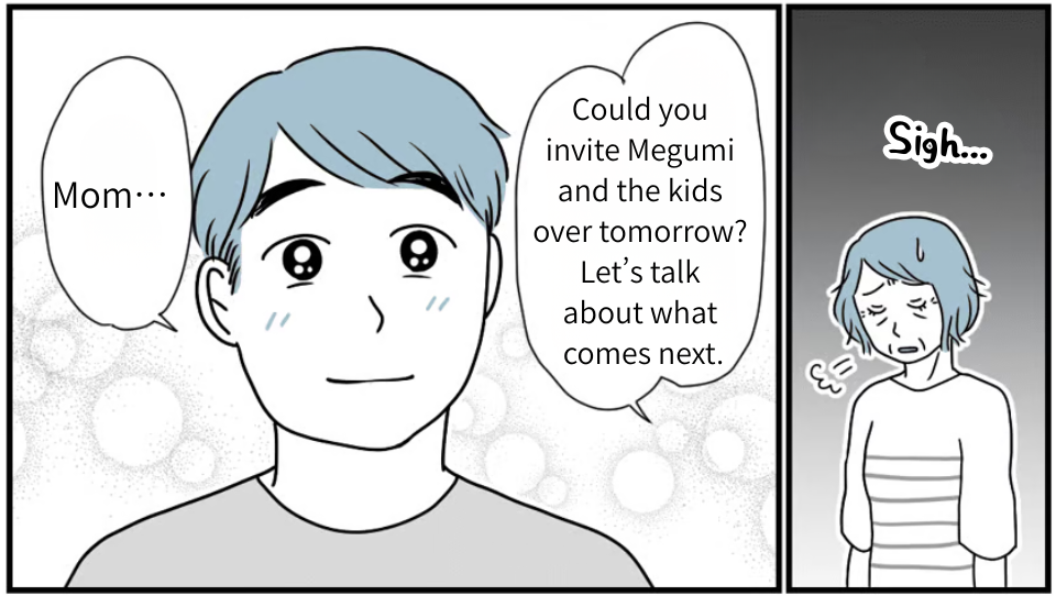 Mom said to me, “Could you invite Megumi and the kids over tomorrow? Let’s talk about what comes next.” It sounded positive. I knew it—she really did want us to live together. She just couldn’t bring it up herself, and she was being considerate of Megumi, too. In the end, I’m the only one who can truly understand how Mom feels. I contacted Megumi right away, and she agreed to come to my parents’ place tomorrow. I’m sure Megumi will agree to living together. At least, that’s what I believe.