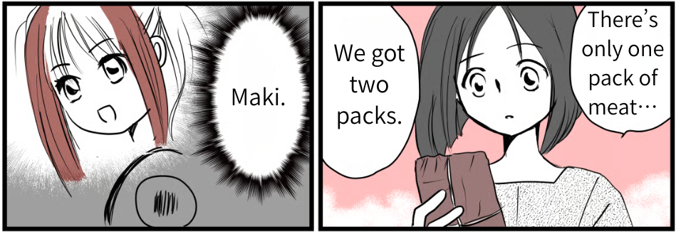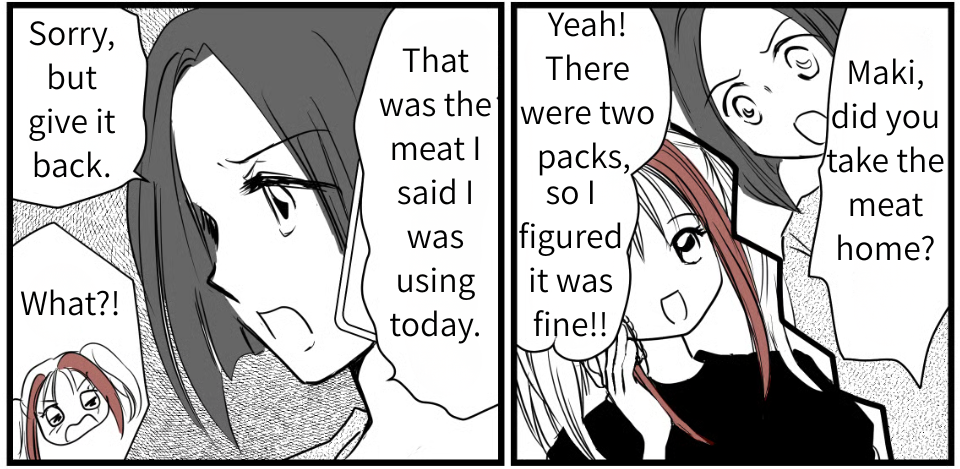 I’ve told Maki over and over, “If you’re going to take something, just let me know.” Still, she makes excuses—saying I looked busy, or that she grabbed it without thinking—and takes things anyway. When we have plenty in stock, I don’t always notice. But when the main ingredient I was planning to use that day suddenly disappears, of course I notice.