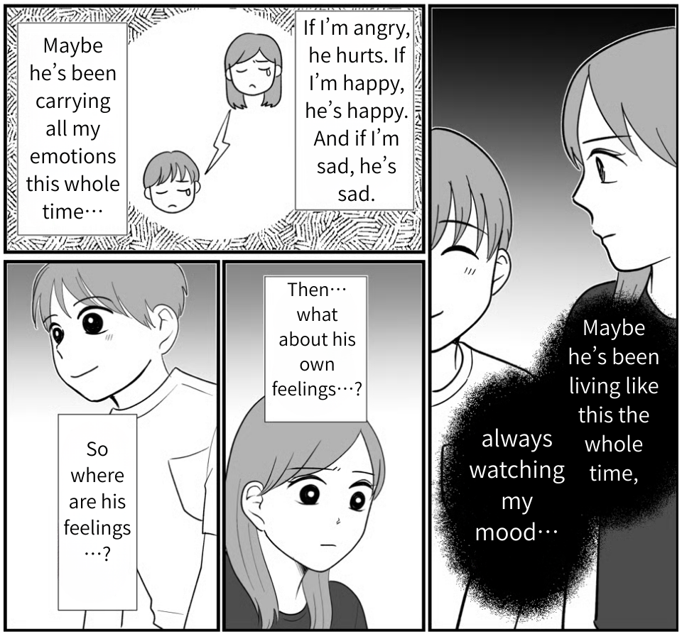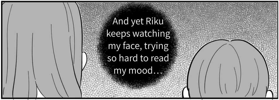Once the anime started, Riku seemed less focused on the show itself and more on my face. He reacted to every tiny change in my expression. Watching him, I suddenly couldn’t tell where his feelings were anymore. Had Riku been unable to express his own emotions all this time? Had he been suppressing how he felt, becoming overly sensitive only to my emotions? When that realization hit me, the tears just started to fall.