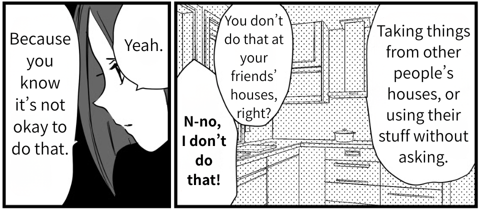 I’m Maki (26). I’ve been sort of living together with my boyfriend, Tsubasa (26). We promised each other that we’d get married once we had some savings, but earlier today he stormed out after getting angry. He told me it was rude to take food and other things from my family’s house without asking, and that using someone else’s belongings like they’re your own without permission is bad manners. This was our first real fight since moving in together. I didn’t know what to do, so I went to talk to my older brother and my sister-in-law, Akane.