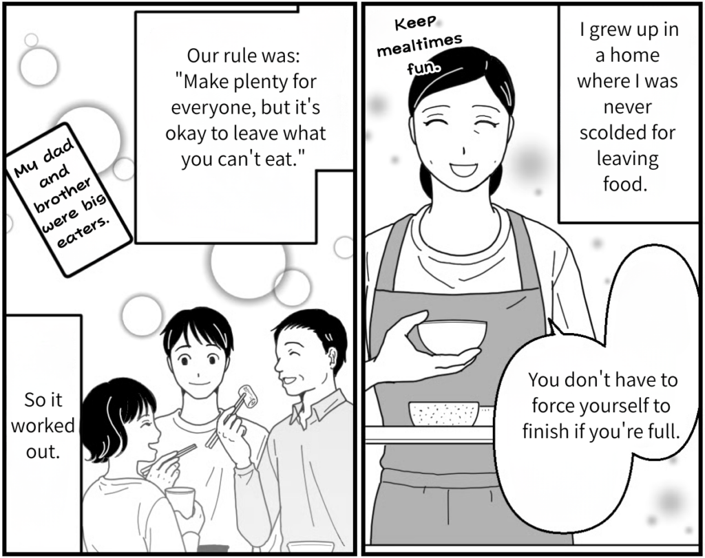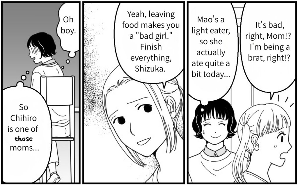 But it turns out Chihiro is a “zero leftovers” kind of person. When Shizuka looked for confirmation, asking, “She’s being a bad girl, right?” Chihiro didn’t hold back and said, “Yeah, you’re a bad girl if you leave food”. I get that she’s always teaching her daughter not to waste food and didn’t want to break character, but did she really have to call someone else’s child “bad” right to her face?