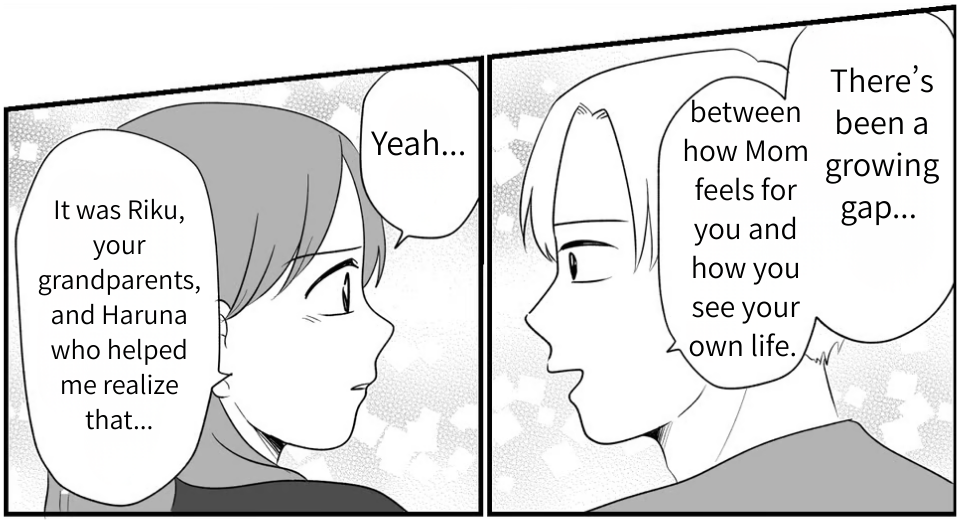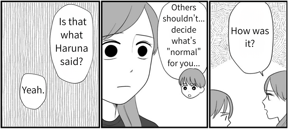 It was clear that Haruna had a massive impact on Riku. In the past, just hearing her name would have made my skin crawl, but those feelings had somehow faded away. In fact, I now feel like Haruna was the one who finally opened my eyes after I’d lived with such tunnel vision for so long. It was wrong of me to label someone as “not normal” based solely on my own values… but more than that, it’s not anyone’s place to judge whether someone else is “normal” or not, regardless of their values. I took Riku’s honest words to heart, and we sat down together to talk about our future.