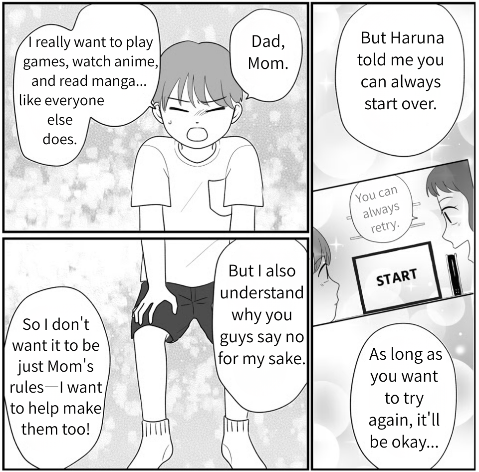I’m Nanami, and I live with my husband, Tatsuya, and our third-grade son, Riku. I’ve poured my entire life into raising him to be a successful adult. But lately, Riku has stopped going to school… Amidst all this, we agreed to let him stay at his grandparents’ house three times a week, as he requested. However, I found out Riku was actually going to my sister-in-law Haruna’s place, playing the very video games I’d always forbidden! I was furious. My in-laws had been deceiving me. To make matters worse, instead of supporting me, my husband took their side… I felt betrayed and completely exhausted. Then, my husband suggested we spend the weekend doing whatever Riku wanted. But while watching anime, Riku kept checking my face, worried about my reaction. I realized he had started prioritizing my feelings over his own. When I finally asked him if there was anything he wanted to say, he told me that going to Haruna’s was his own choice.