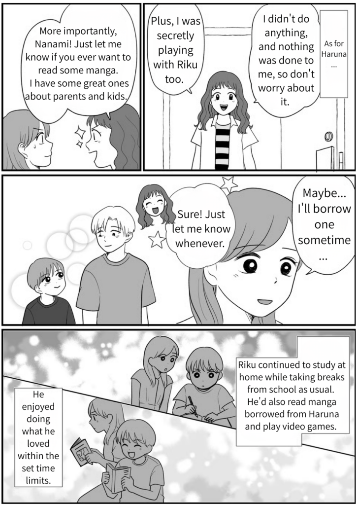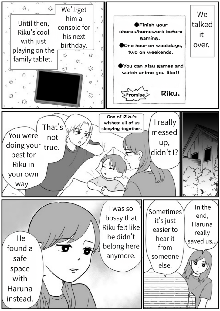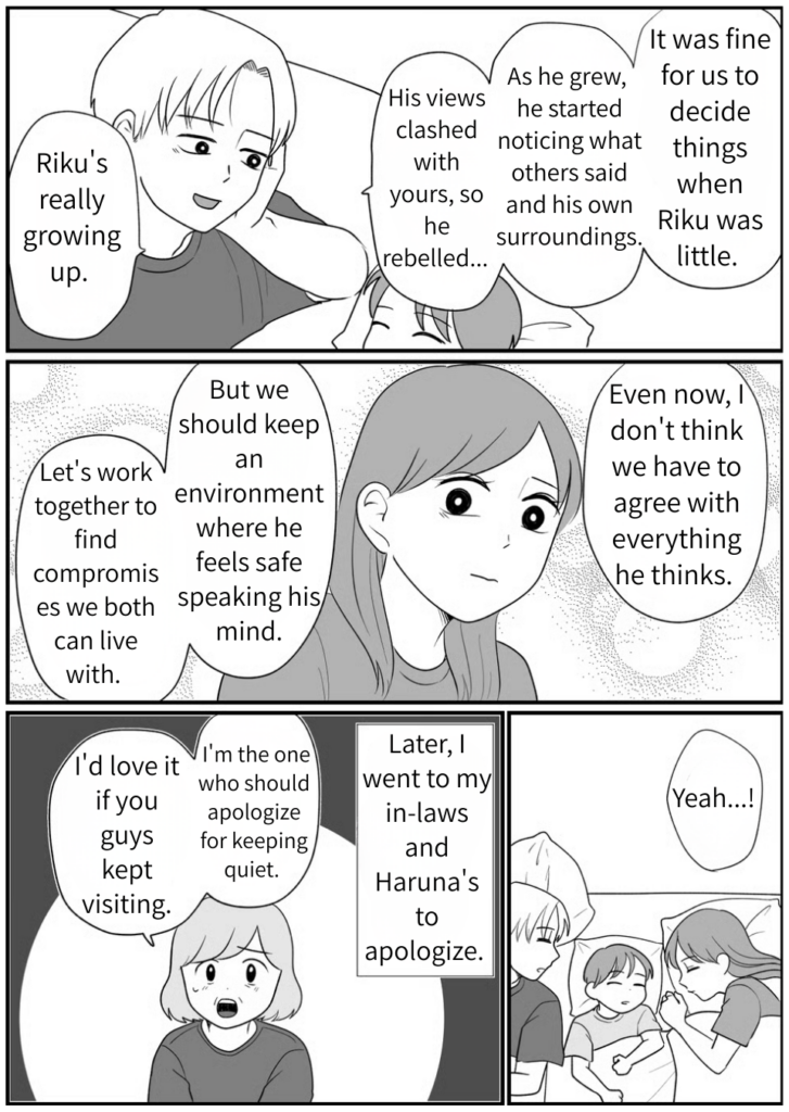 Neither my in-laws nor Haruna blamed me for anything. I expected them to be furious, but they actually said they were just happy to see me looking so much brighter. They are such incredibly kind people. I felt so ashamed of how I’d acted that I apologized with everything I had. Since we started listening to Riku and working together to find compromises we could all live with, the house has become surprisingly peaceful, and Riku has started heading back to school. Now, he enjoys going to school every day. Looking back, I’m truly grateful he had Haruna’s place to go to during that time. From now on, I don’t want to just force my views on him; I want our parenting to be a conversation we have as a family.