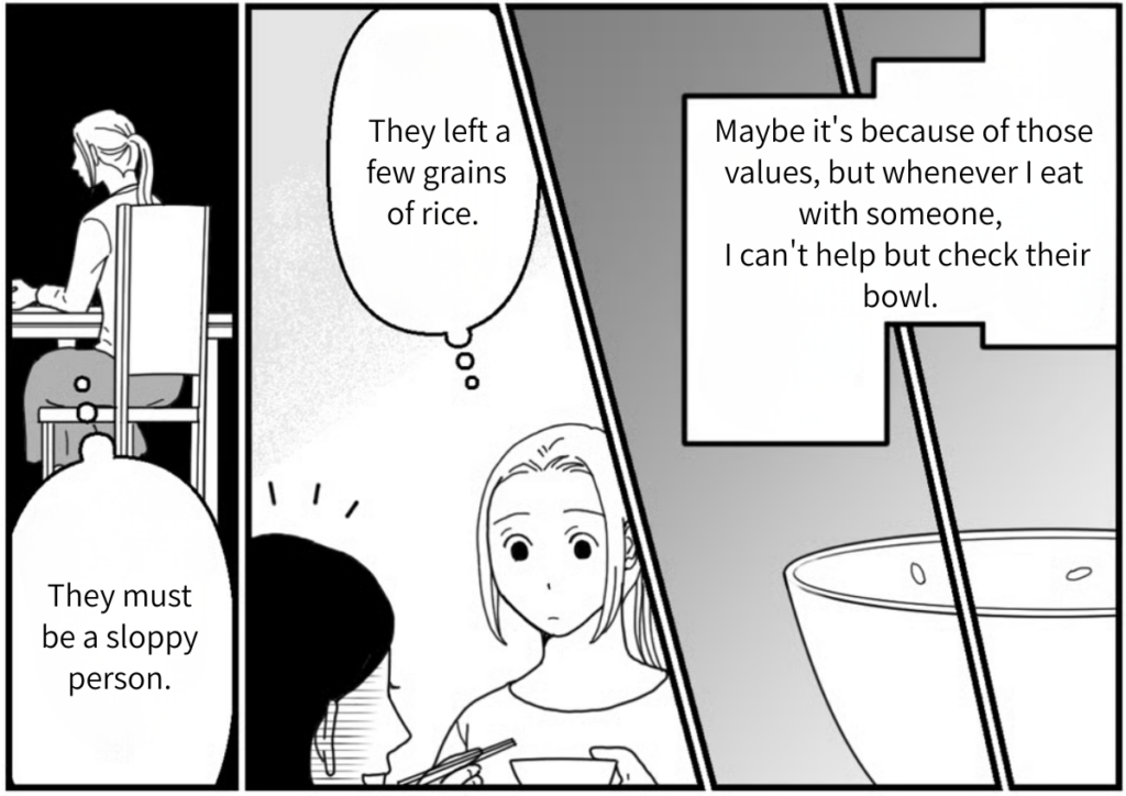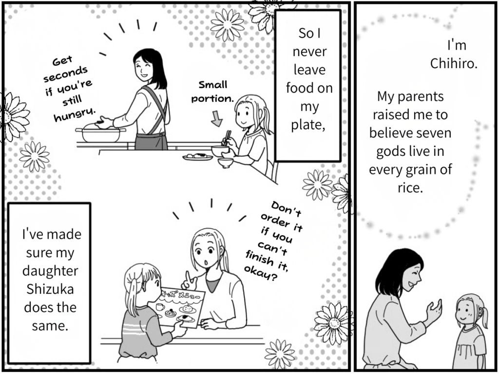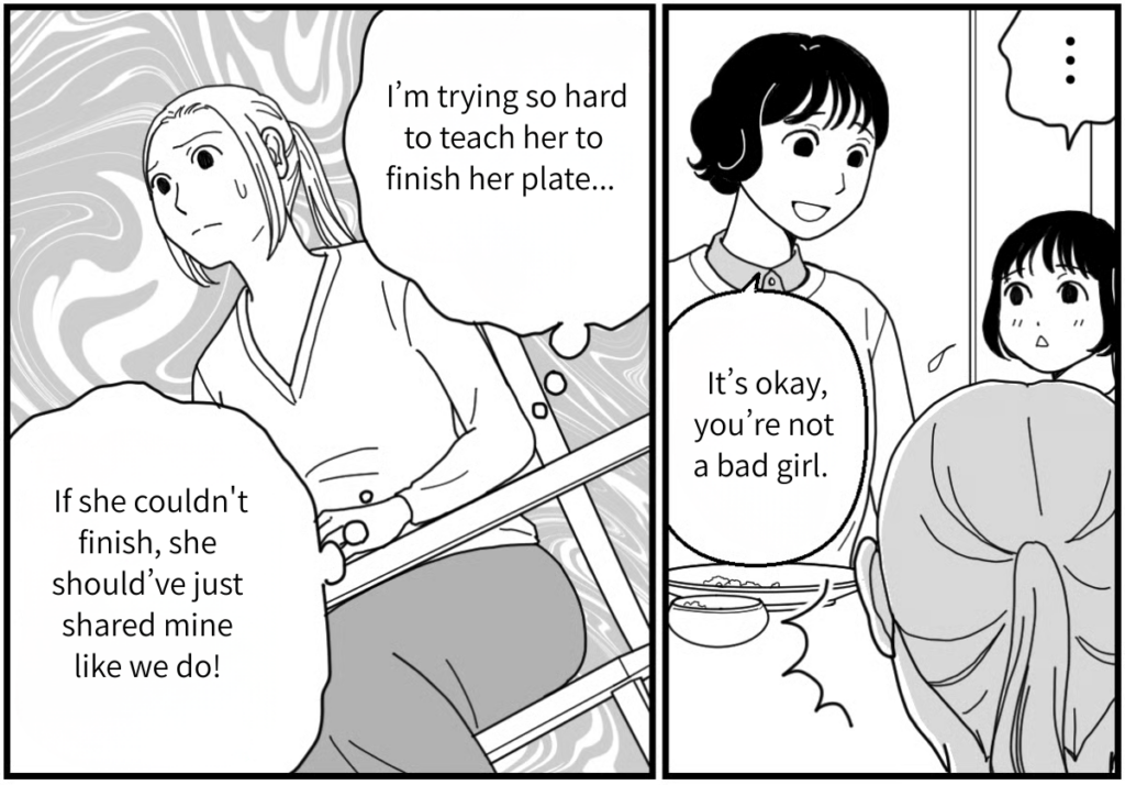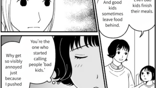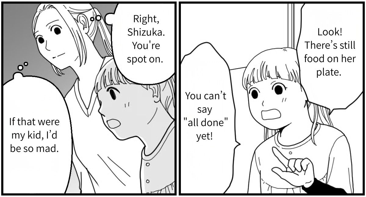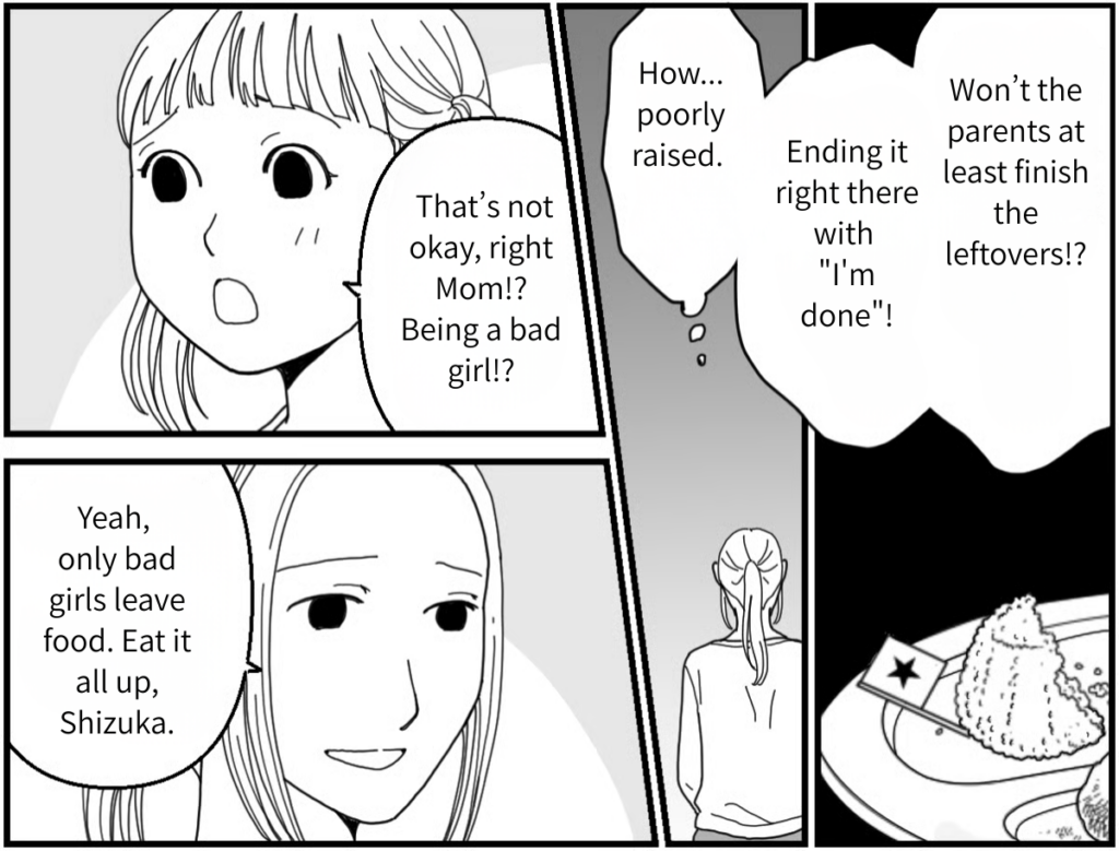 I’m Chihiro, and I’m raising my five-year-old daughter, Shizuka. Today, we went to a family restaurant with Kasumi and her daughter, Mao (also five), who is in the same extracurricular class as Shizuka. I was shocked when Mao left half of her kids’ meal and Kasumi just calmly let her finish. To me, ordering food and not finishing it is unacceptable. When Shizuka asked in surprise, “She’s being a bad girl, right?” I told her flat out, “Yeah, only bad girls leave food behind.”