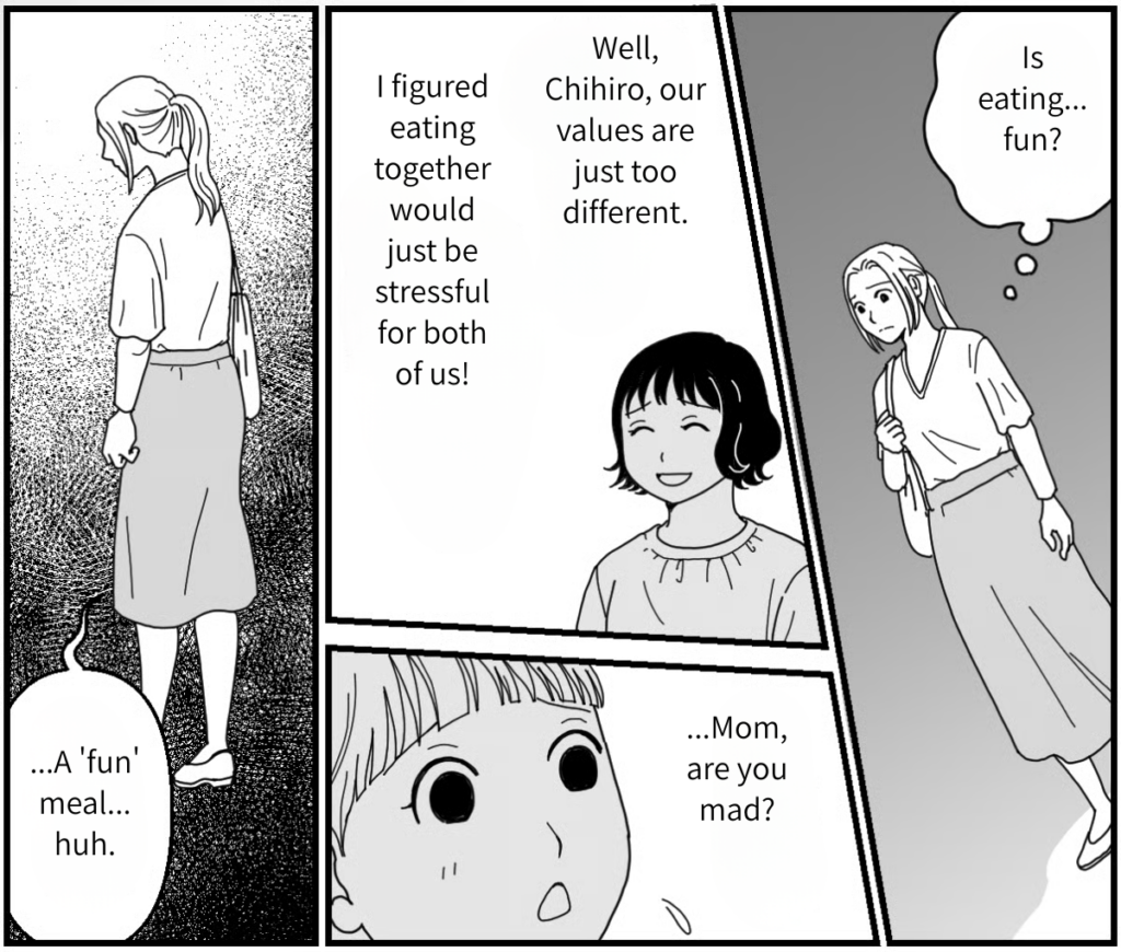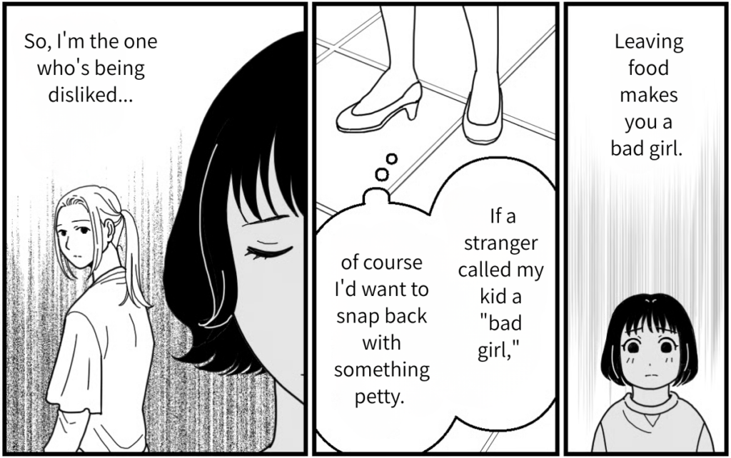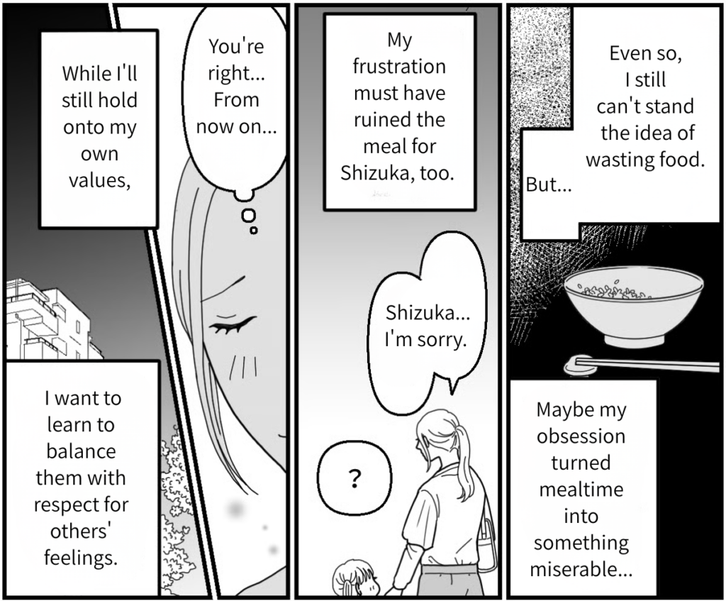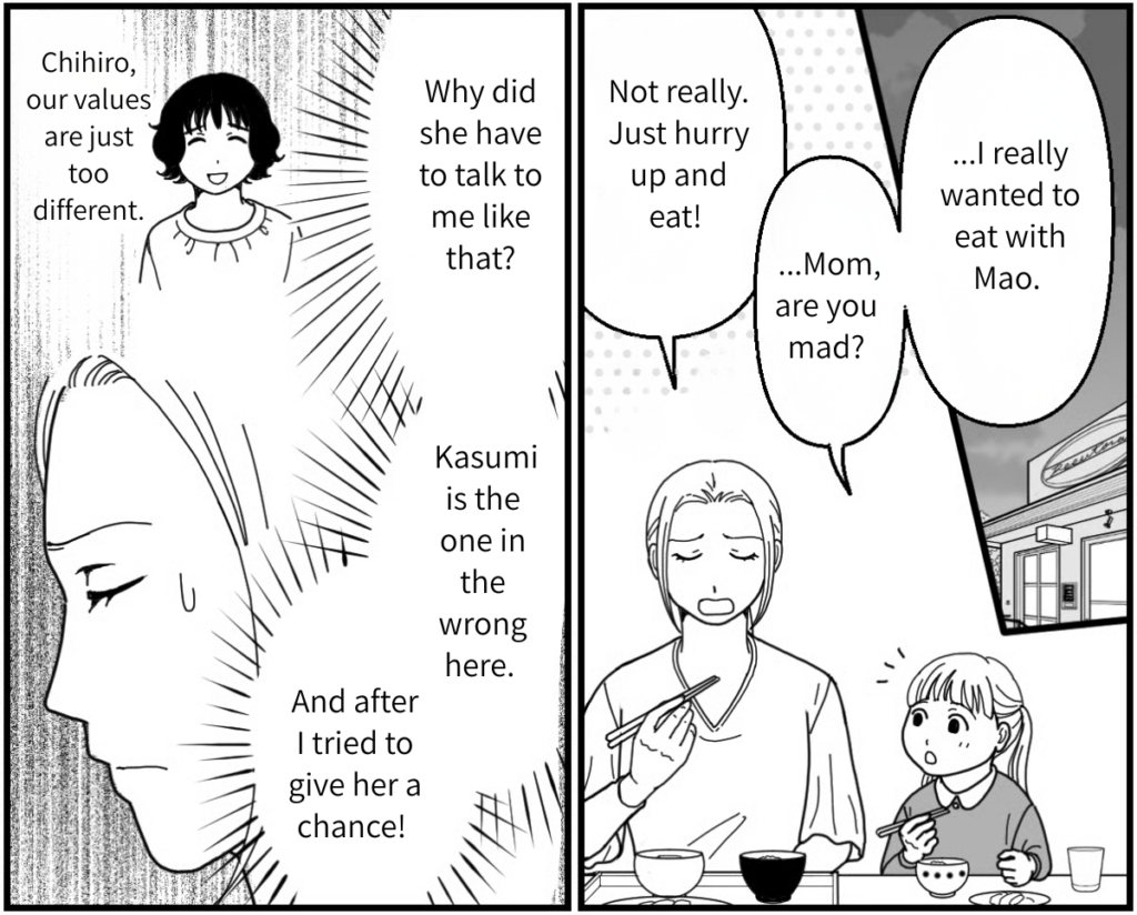 I’ll never get over my hatred for wasting food, and I can’t say I agree with Kasumi’s way of parenting. But I was so busy acting self-righteous and looking down on her… I was trying to force my own values on someone else. That’s something I really need to reflect on. I was so obsessed that I got all worked up, and I’m sure Shizuka didn’t enjoy her meal at all. Because of me, she can’t eat with Mao anymore, and I made her feel so sad. If a stranger called my kid a “bad girl,” of course I’d want to snap back with something petty. No matter what the situation is, I want to start thinking about other people’s feelings.