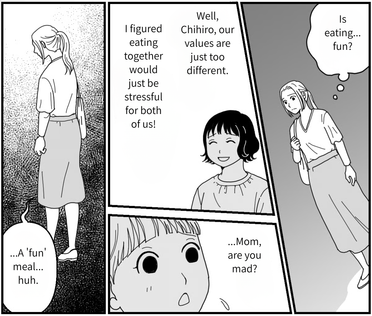 I’m Chihiro, and I’m raising my five-year-old daughter, Shizuka. The other day, we went to a restaurant with Kasumi and her daughter, Mao, who’s in the same class as Shizuka. It turns out Kasumi is exactly the type of person I despise most—someone who thinks nothing of wasting food. That’s why I said right in front of Mao that leaving food makes you a “bad girl.” I thought that if Kasumi showed some remorse, I might be willing to keep being friends… but in the end, I was the one who got rejected.