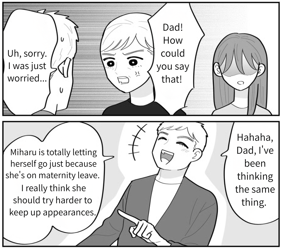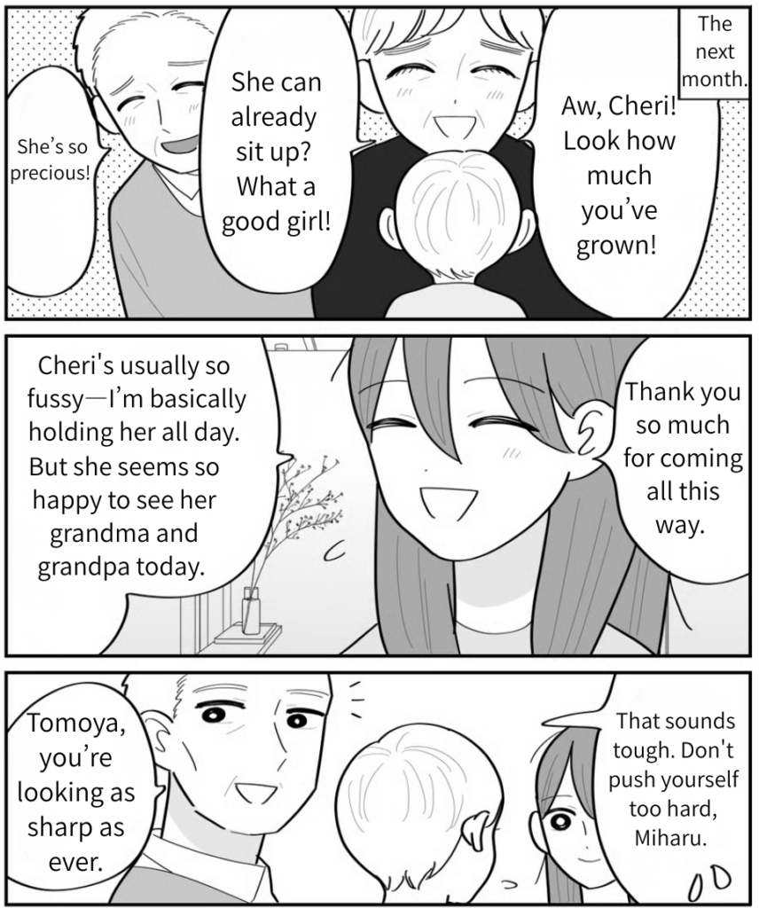 I was actually really happy to have my in-laws over. Cheri was in a great mood being passed around for cuddles, and just seeing how much they loved her felt like a breath of fresh air. But then, my father-in-law said something that caught me off guard. I’m sure it came from a place of concern, but when he pointed out my appearance, I just froze. To make matters worse, Tomoya just laughed it off, saying I’m “letting myself go” because I’m on maternity leave. Who does he think is responsible for that?! I went past being angry—I was just heartbroken.