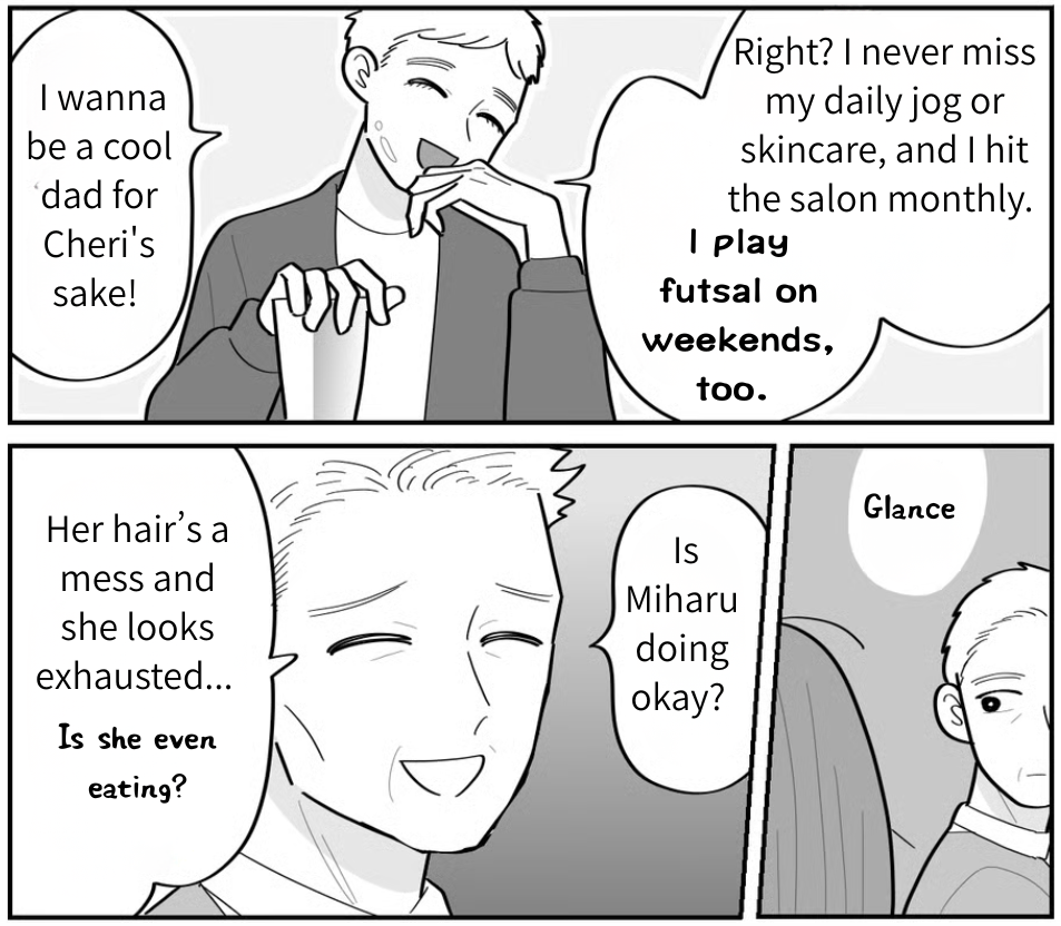 I’m Miharu. I live with my husband, Tomoya, and our six-month-old daughter, Cheri. Cheri is adorable, but her constant fussing is completely draining. It would be so much easier if Tomoya pitched in, but he’s obsessed with his “self-care”—skincare, workouts, you name it. Shouldn’t your priorities shift once you have someone to protect? I feel like I’m the only one making sacrifices, and I’m at my breaking point. Then, one day, my in-laws came to visit…