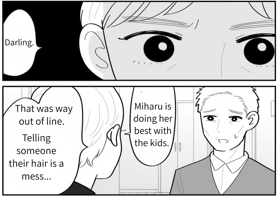 I’m Miharu. I live with my husband, Tomoya, and our six-month-old daughter, Chieri. Tomoya is obsessed with “self-improvement”—you know, daily skincare routines, hitting the gym, the whole nine yards. Meanwhile, I can’t even find the time for a decent shower, let alone a trip to the salon. Then one day, my in-laws came to visit from out of town. When my father-in-law saw me and mentioned my hair was a mess and I looked exhausted, Tomoya just laughed it off, saying I was “slacking on my looks” because I’m on maternity leave. That’s when my mother-in-law stepped in…