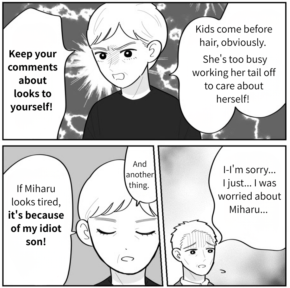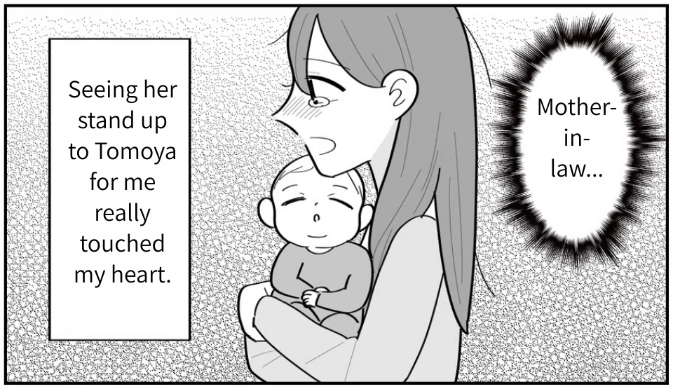 Looking at Tomoya, as polished as ever, and then at me—exhausted with my hair a wreck—my mother-in-law clearly put two and two together. She called him out, saying my exhaustion was his fault and scolding him for being so completely self-absorbed. With no one to turn to, I had been feeling so isolated, like I was being sacrificed just so Tomoya could maintain his “perfect” lifestyle. Having her finally acknowledge my struggle made me feel like I’d been thrown a lifeline. The relief hit me all at once, and I couldn’t help but let the tears fall.