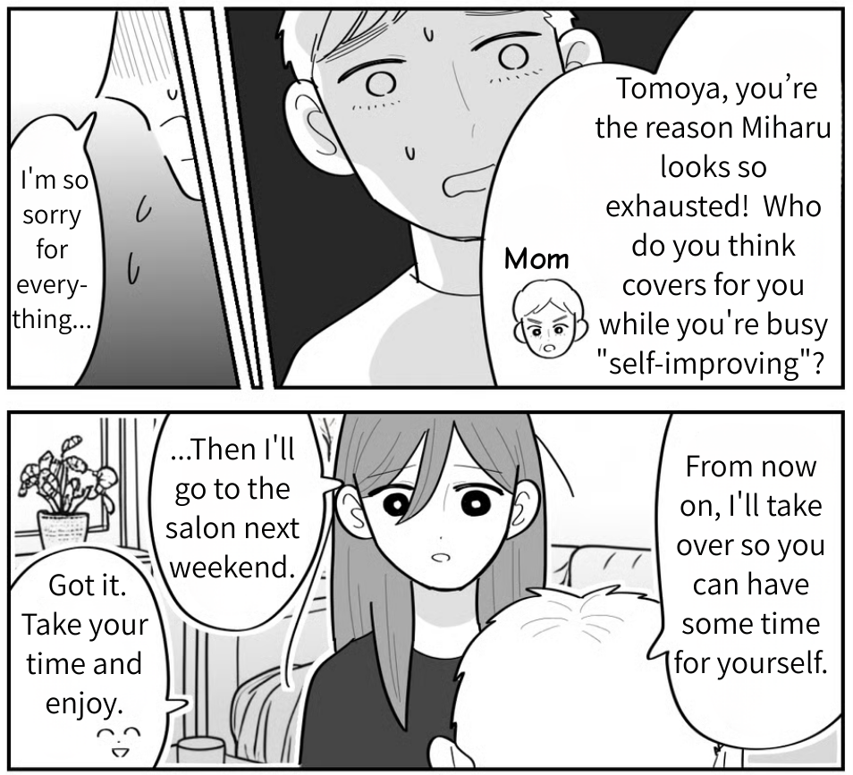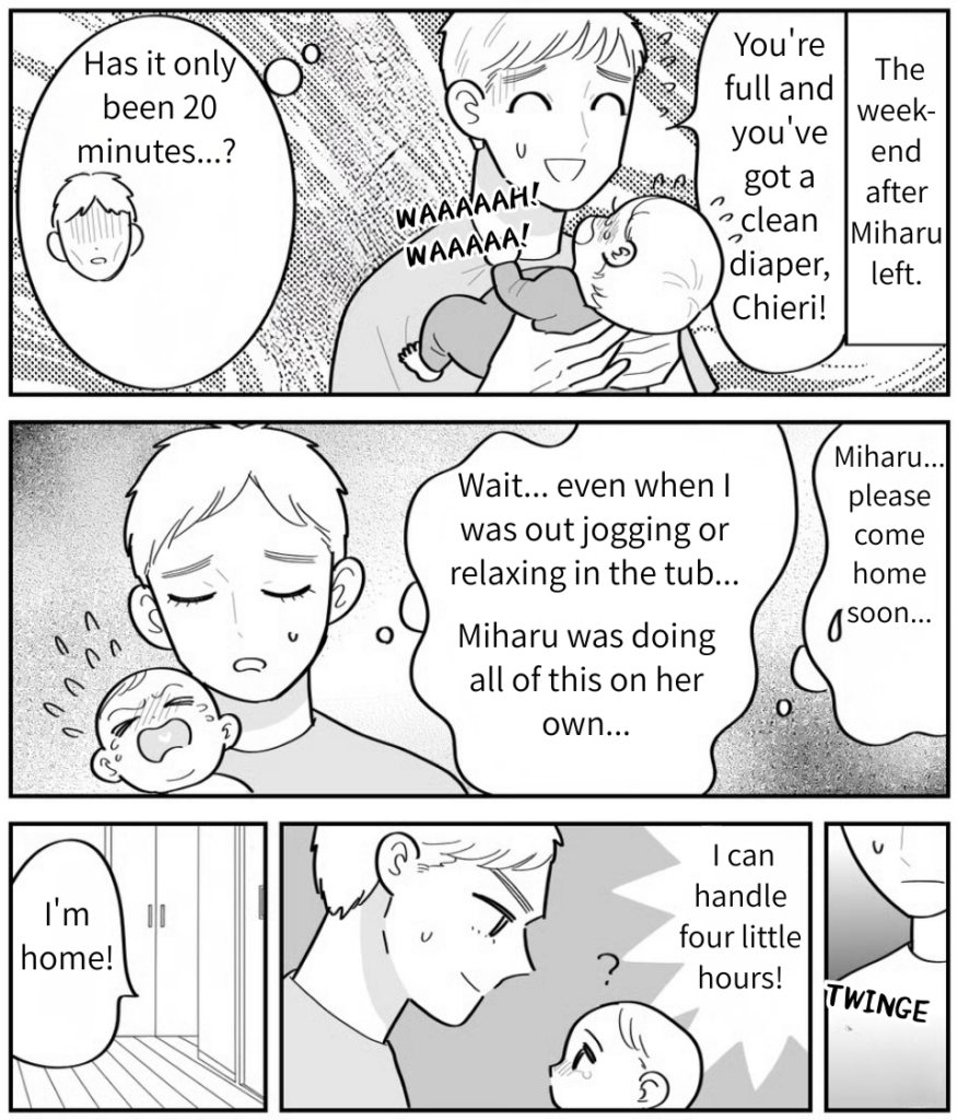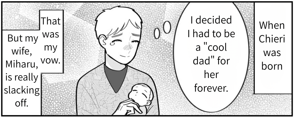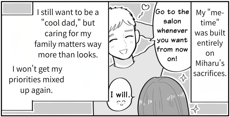 Because I’m into self-improvement, I was working hard to be that “good-looking dad” for Chieri’s sake. But the truth is, my “me-time” was built entirely on Miharu’s sacrifices. There’s no way Chieri is going to love a father who makes her mother cry. My whole mindset was fundamentally flawed. It took my mom spelling it out for me to finally see it—I’ve been such an idiot. From now on, I want to make sure Miharu gets the rest she needs and the time to pamper herself, too. To keep the smiles on Miharu and Chieri’s faces, I’m going to give it my all to be a truly “cool dad”—one who’s defined by his character and how much he cares for his family.