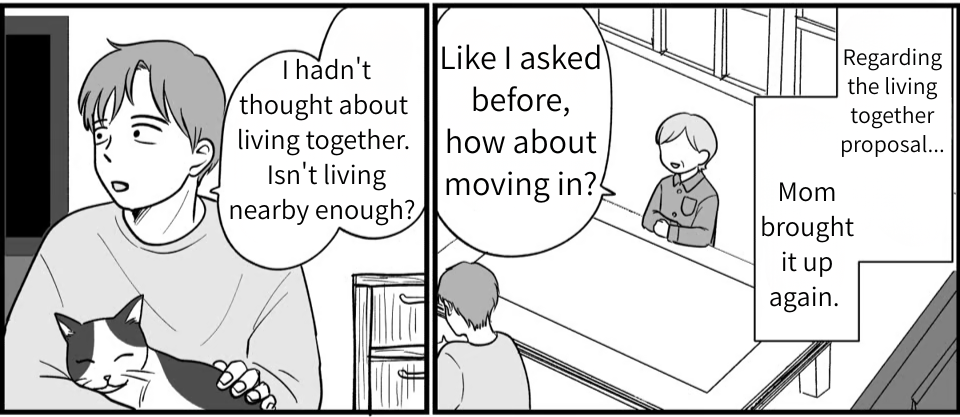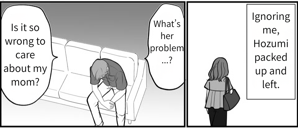 Fed up with me always siding with my mother, Hozumi said she’s moving back to her parents’ place. Isn’t that a bit of an overreaction? But she wouldn’t listen to a word I said and just walked out. As I sit here in despair, I can’t help but think back to life with my mom and brother after my father passed away. My brother and I eventually grew up, got jobs, and started our own lives. Since my brother’s job requires him to move a lot, I felt it was my responsibility to look after Mom. That’s why we started living together in the first place, but it turns out Mom and Hozumi just weren’t compatible. That tension still haunts us today… and I have no idea what to do.